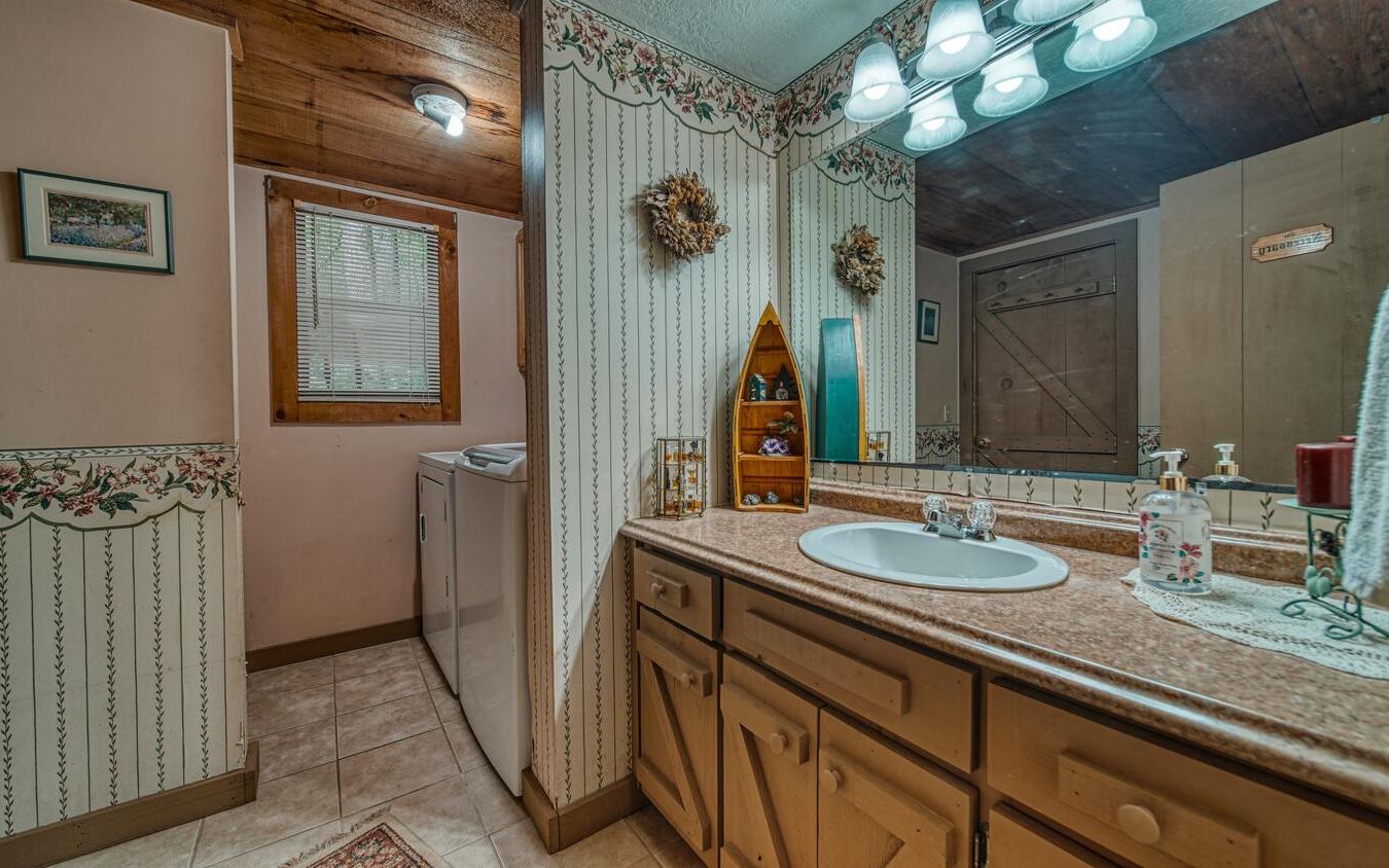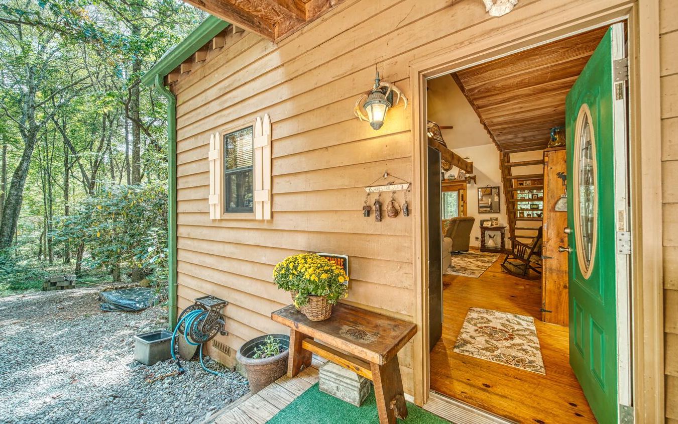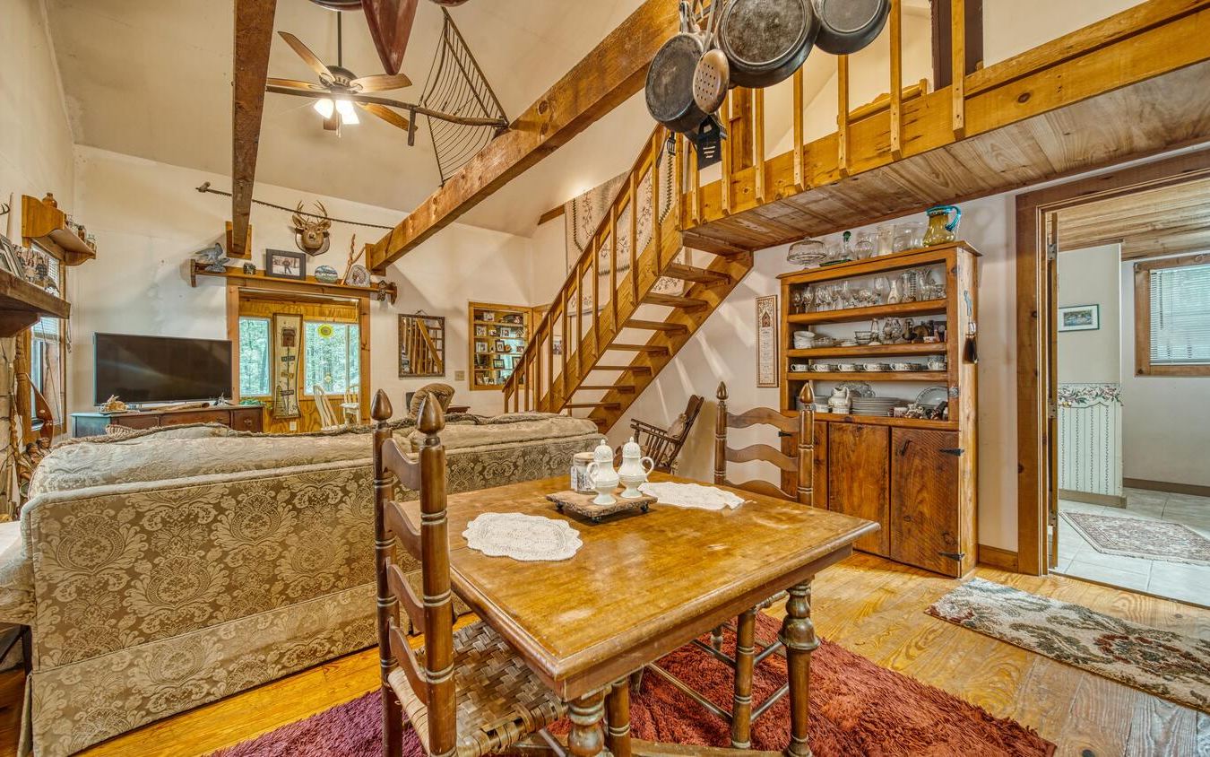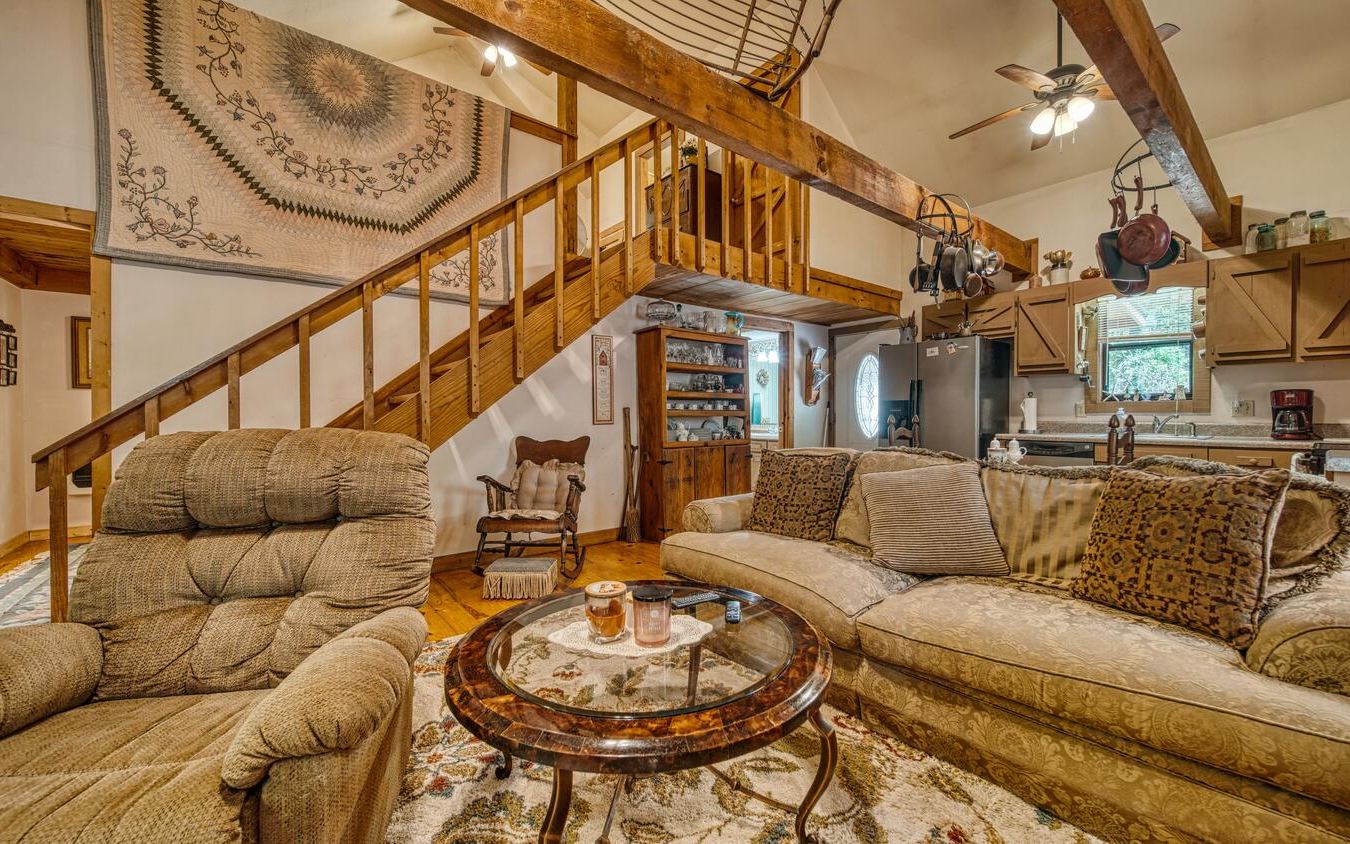 Beautiful cabin nestled in the North Georgia mountains for peace and tranquility. Vaulted ceiling in the living room and kitchen with wood hand hewn beams for an open spacious feeling. Rock fireplace, in living room with and add on dining room, that has lots of windows to enjoy natural lighting and the outdoor atmosphere. Master suite, on main level, has a tile walk in shower. Laundry on main level as well. Natural pine flooring throughout home. Guest suite upstairs with private bath. House is handicap accessible. Enjoy the outside deck for grilling, and entertaining while overlooking the Koi pond with waterfall below.