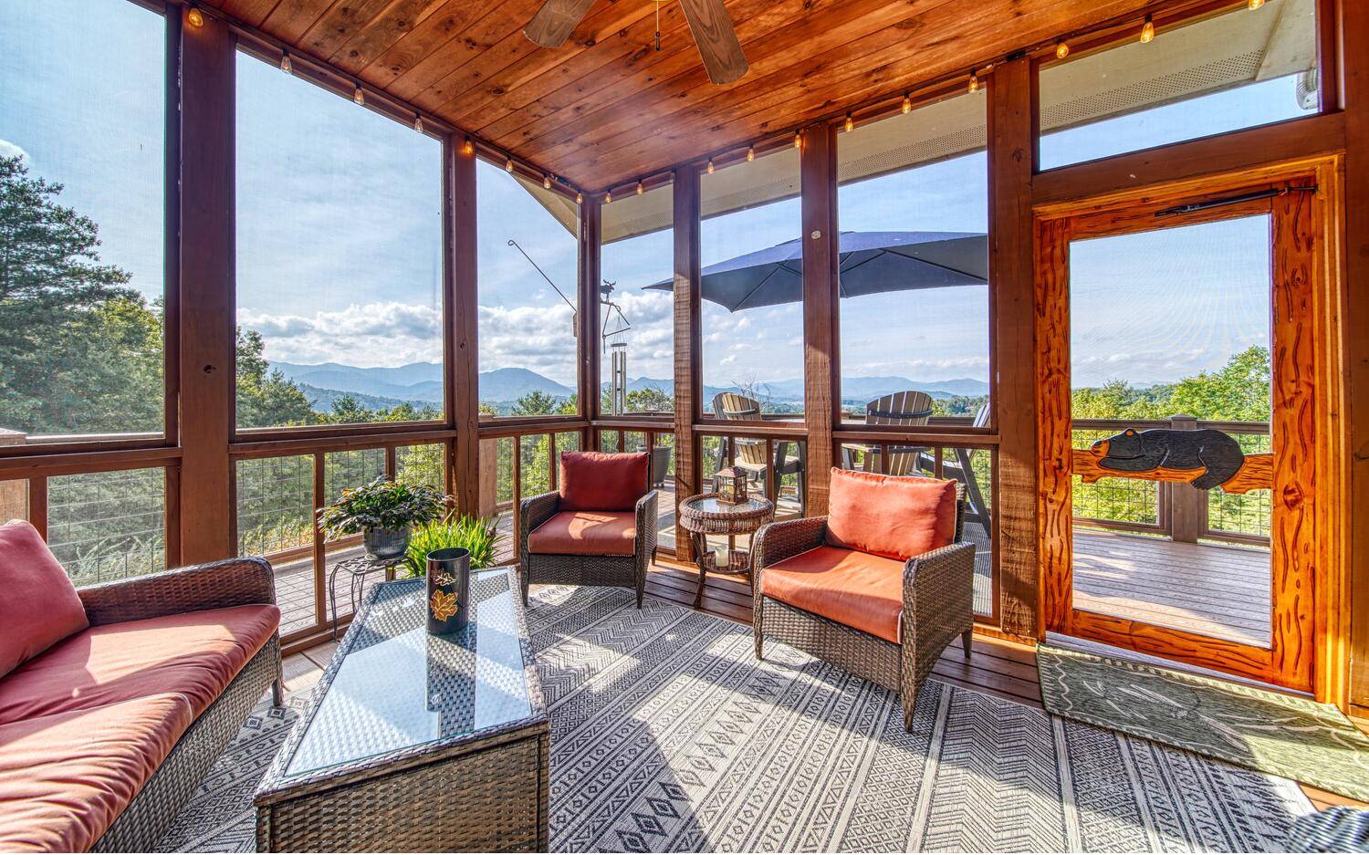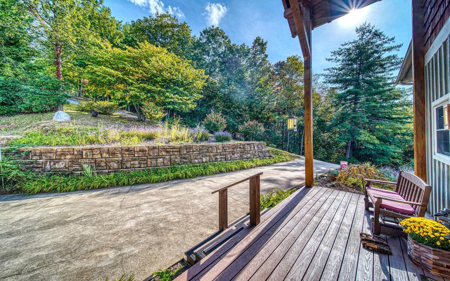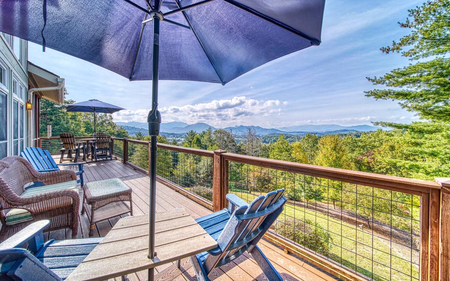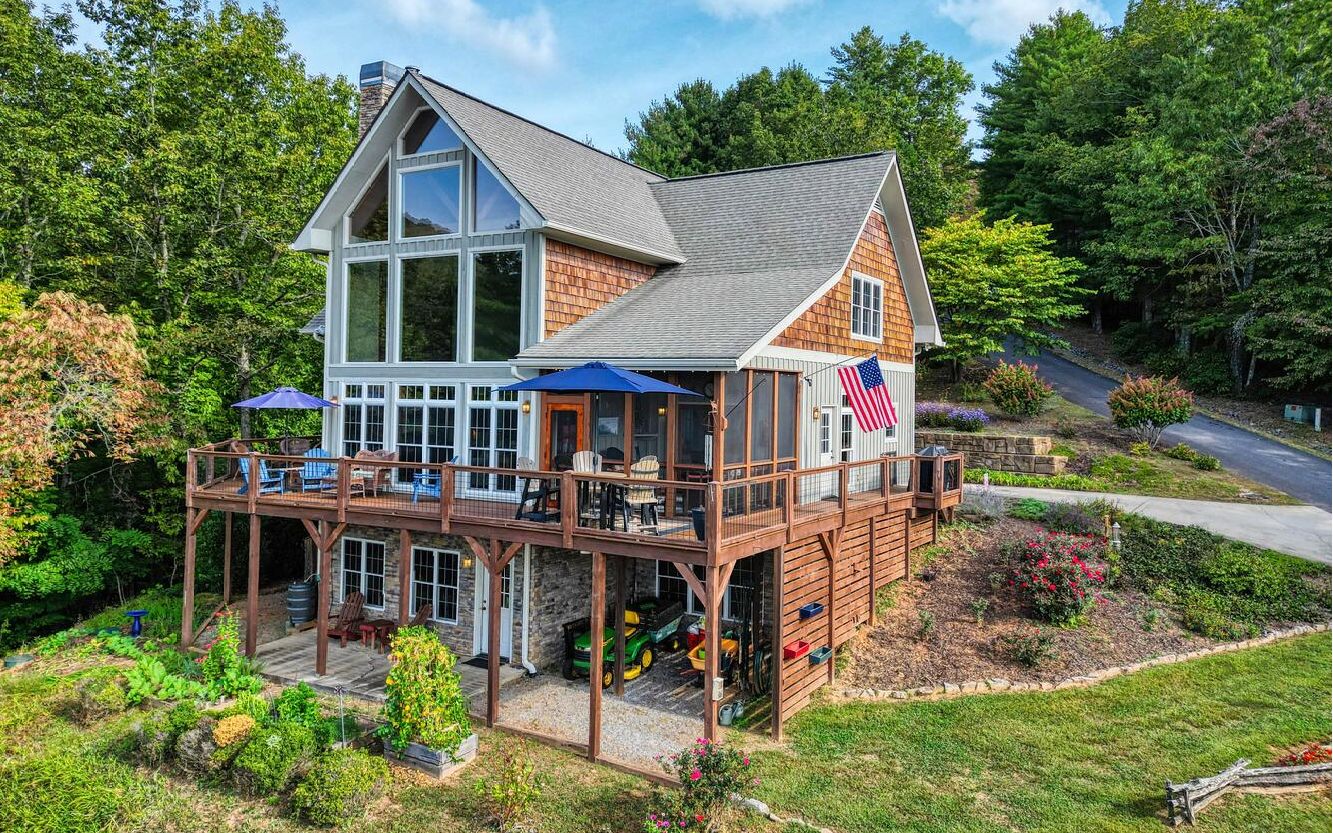 Private. Quiet. Magnificent! This mountain home 'lives large' with the scale, rooms & design to back it up! Wood floors, solid doors, gorgeous beams spanning the 28' main living with T&G ceiling & floor to ceiling stone fireplace all complement! Nice kitchen with SS, granite, pantry & laundry! Thru the adjacent dining to the screened porch & full width Trex deck with unobscured views & that sought after Southern Exposure as far as the eye can see! Primary on the main with deck access, 2 guest suites with their own baths up & great loft space for reading or work IF you can ignore the views! Terrace level offers another guest room & bath, workout/hobby/den, workshop & 2nd living area with 2nd fireplace & wet bar! Incredible privacy provided by nature with peeks of the golf course all accented by the addition of multiple fruit trees, grapevines and gorgeous perennials! Ready? This is your next move!