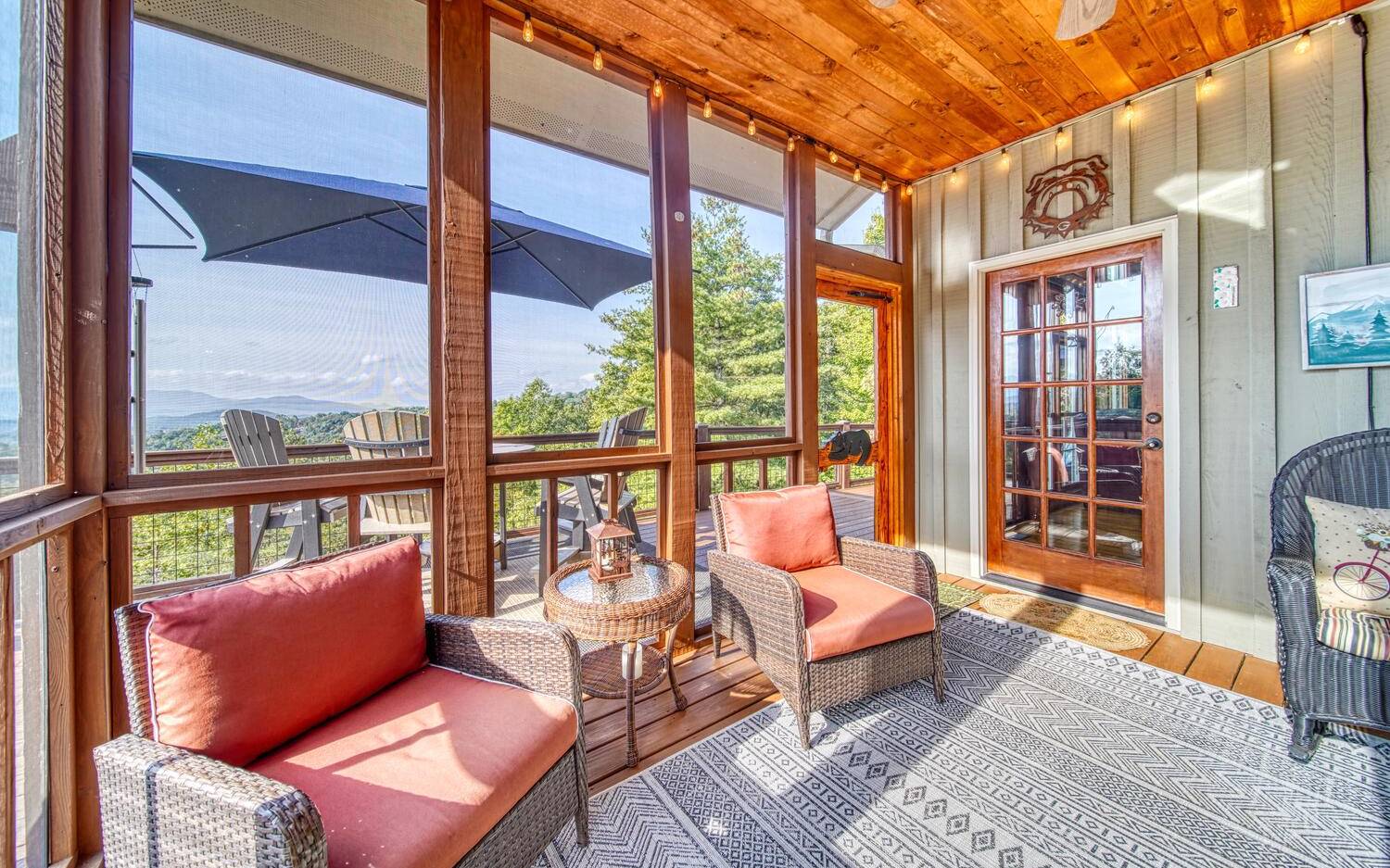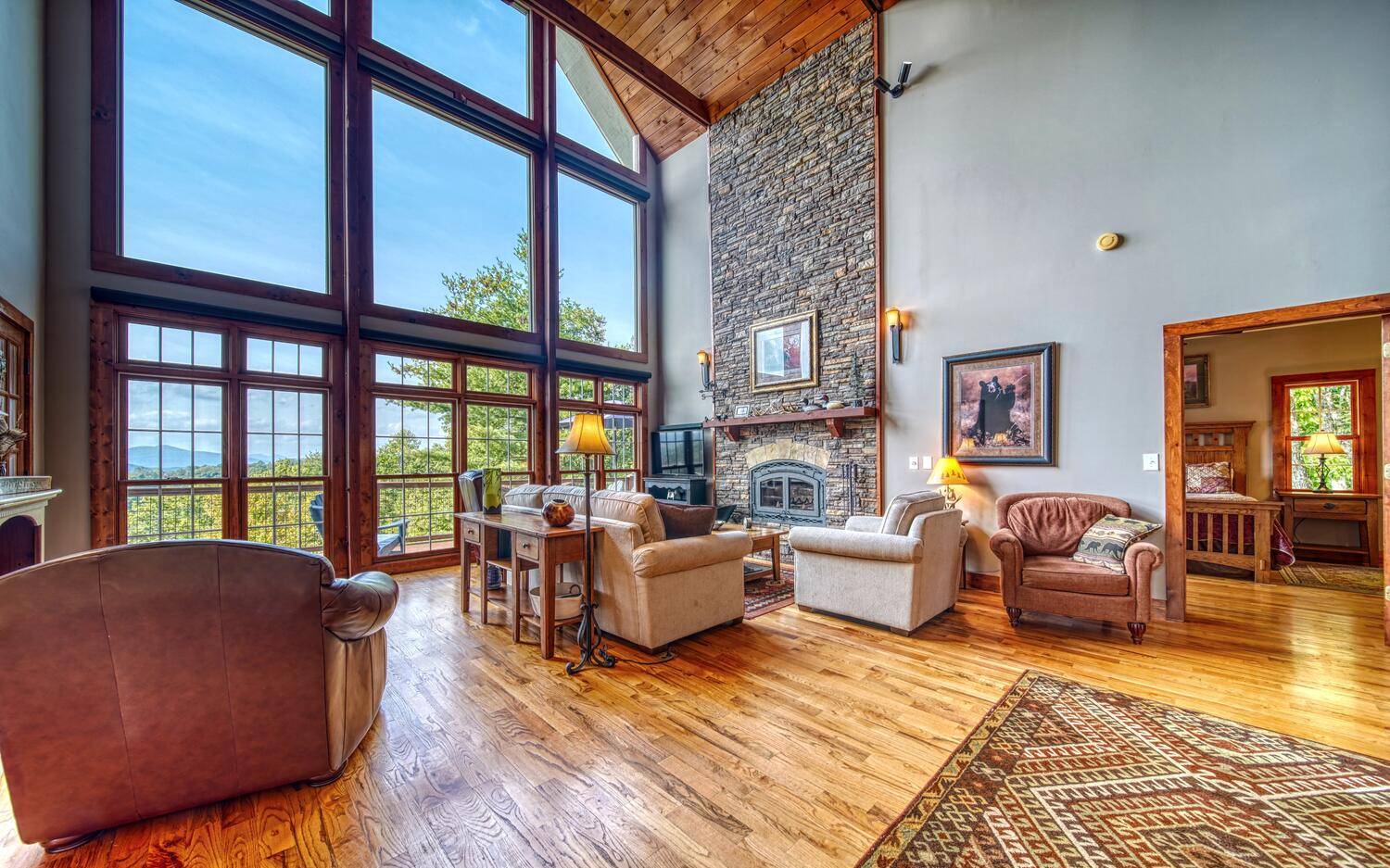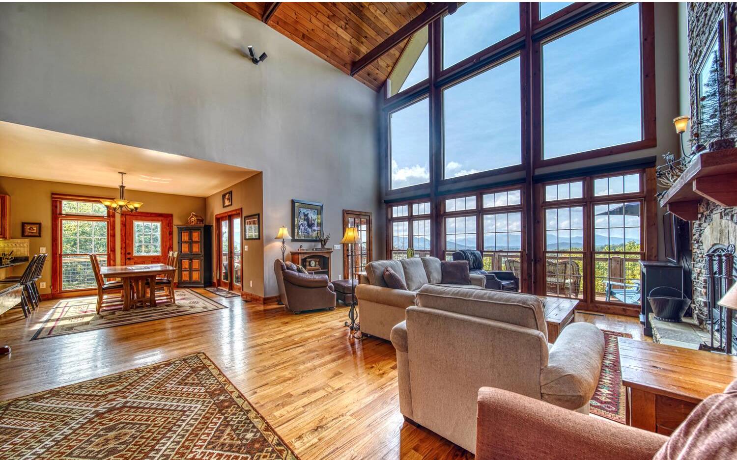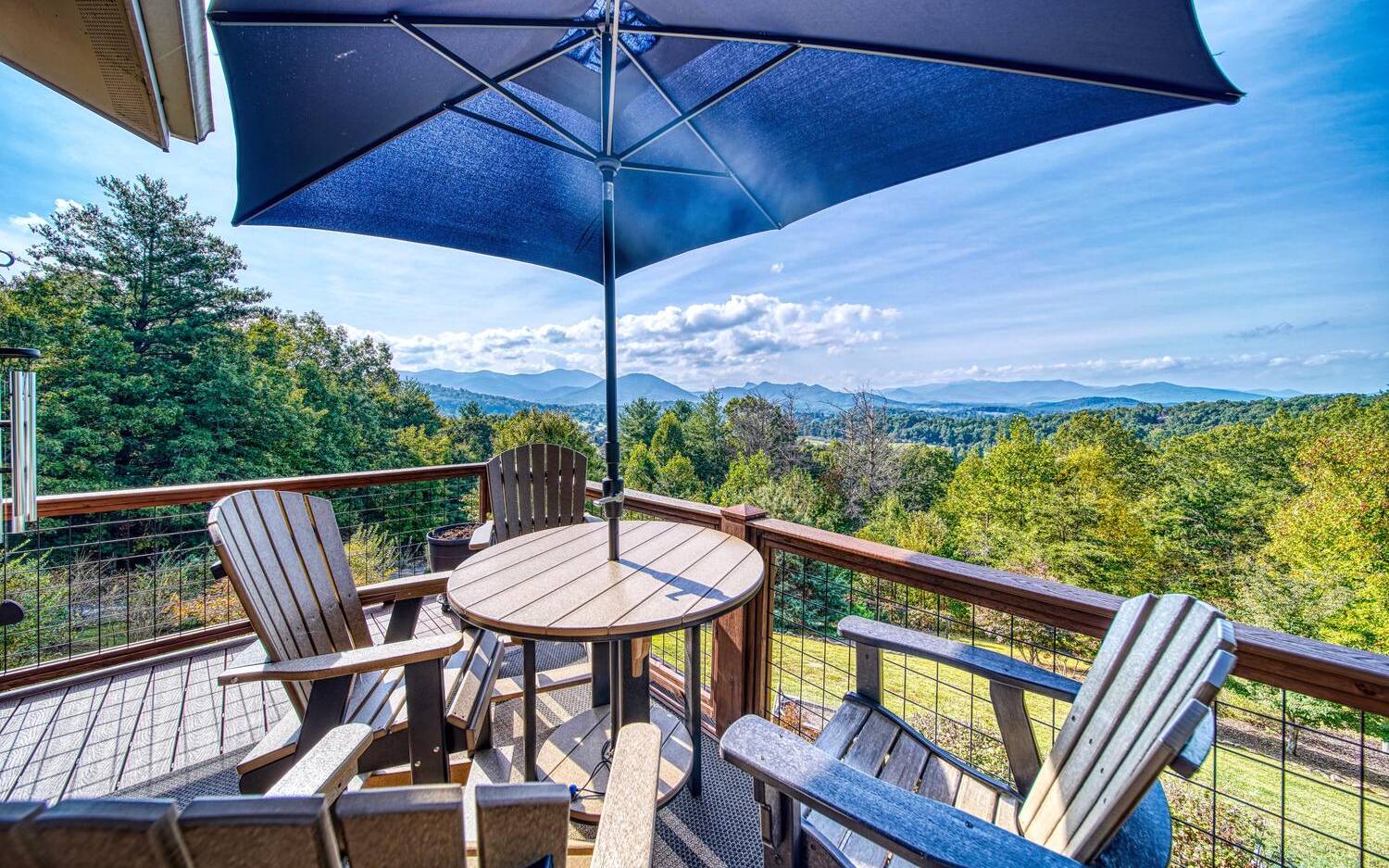 Private. Quiet. Magnificent! This mountain home 'lives large' with the scale, rooms & design to back it up! Wood floors, solid doors, gorgeous beams spanning the 28' main living with T&G ceiling & floor to ceiling stone fireplace all complement! Nice kitchen with SS, granite, pantry & laundry! Thru the adjacent dining to the screened porch & full width Trex deck with unobscured views & that sought after Southern Exposure as far as the eye can see! Primary on the main with deck access, 2 guest suites with their own baths up & great loft space for reading or work IF you can ignore the views! Terrace level offers another guest room & bath, workout/hobby/den, workshop & 2nd living area with 2nd fireplace & wet bar! Incredible privacy provided by nature with peeks of the golf course all accented by the addition of multiple fruit trees, grapevines and gorgeous perennials! Ready? This is your next move!