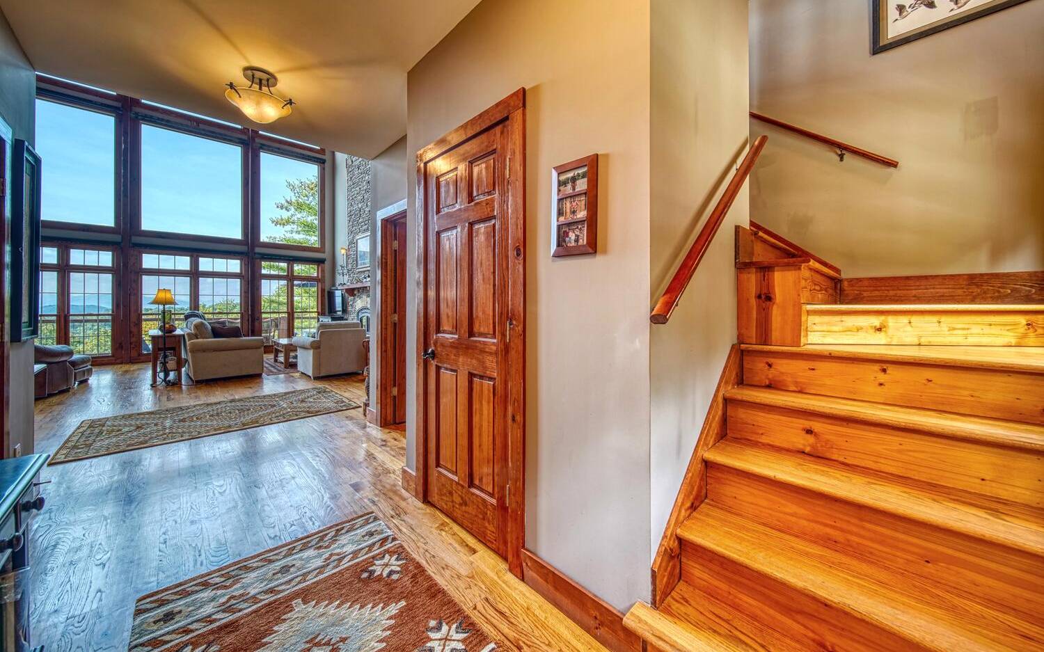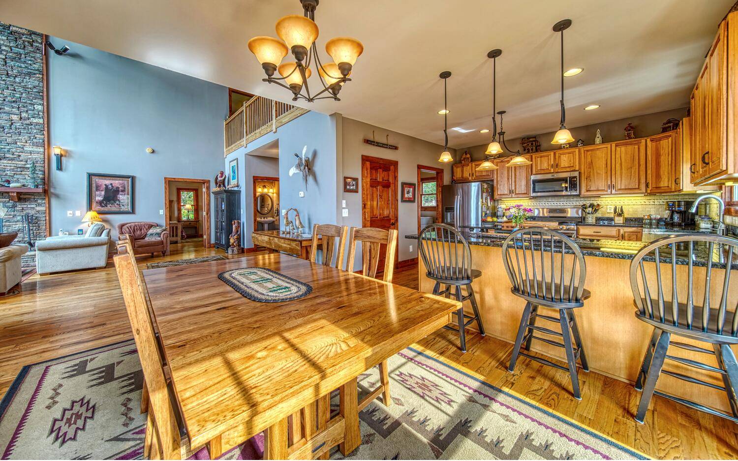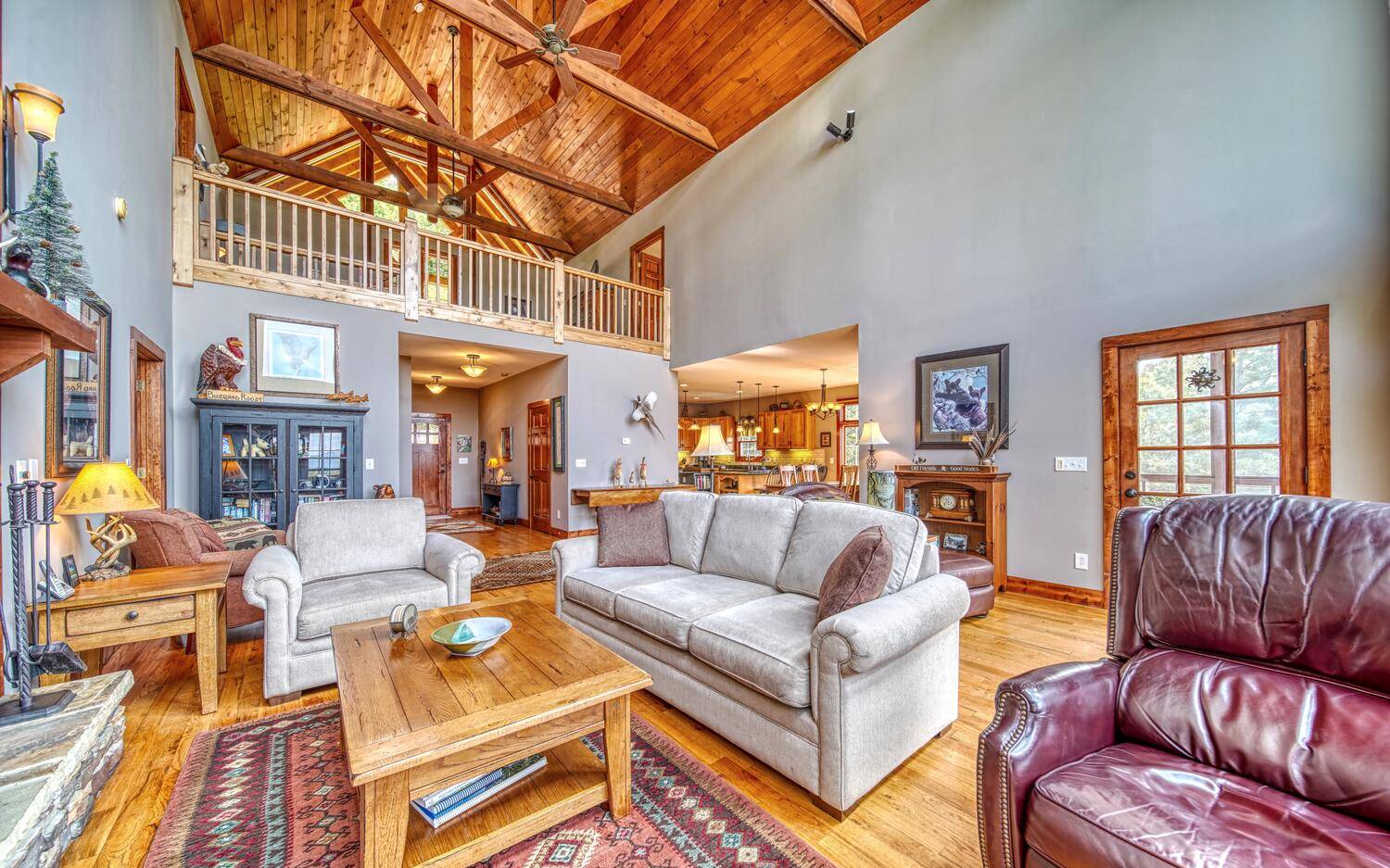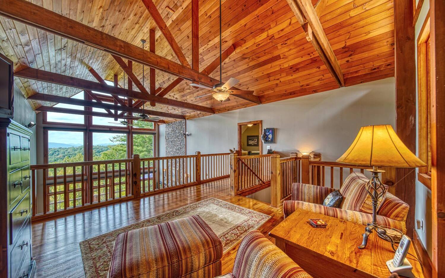 Private. Quiet. Magnificent! This mountain home 'lives large' with the scale, rooms & design to back it up! Wood floors, solid doors, gorgeous beams spanning the 28' main living with T&G ceiling & floor to ceiling stone fireplace all complement! Nice kitchen with SS, granite, pantry & laundry! Thru the adjacent dining to the screened porch & full width Trex deck with unobscured views & that sought after Southern Exposure as far as the eye can see! Primary on the main with deck access, 2 guest suites with their own baths up & great loft space for reading or work IF you can ignore the views! Terrace level offers another guest room & bath, workout/hobby/den, workshop & 2nd living area with 2nd fireplace & wet bar! Incredible privacy provided by nature with peeks of the golf course all accented by the addition of multiple fruit trees, grapevines and gorgeous perennials! Ready? This is your next move!