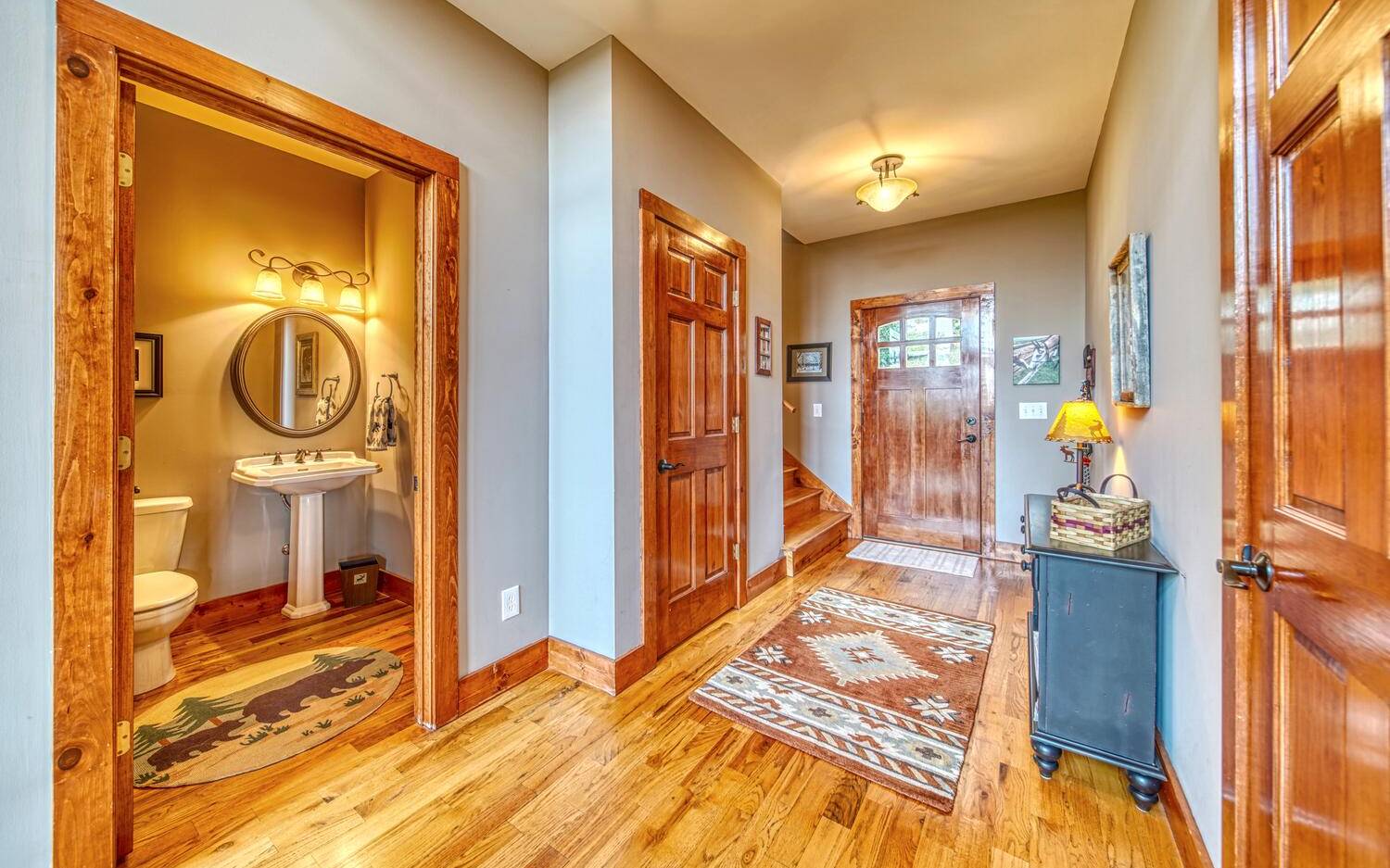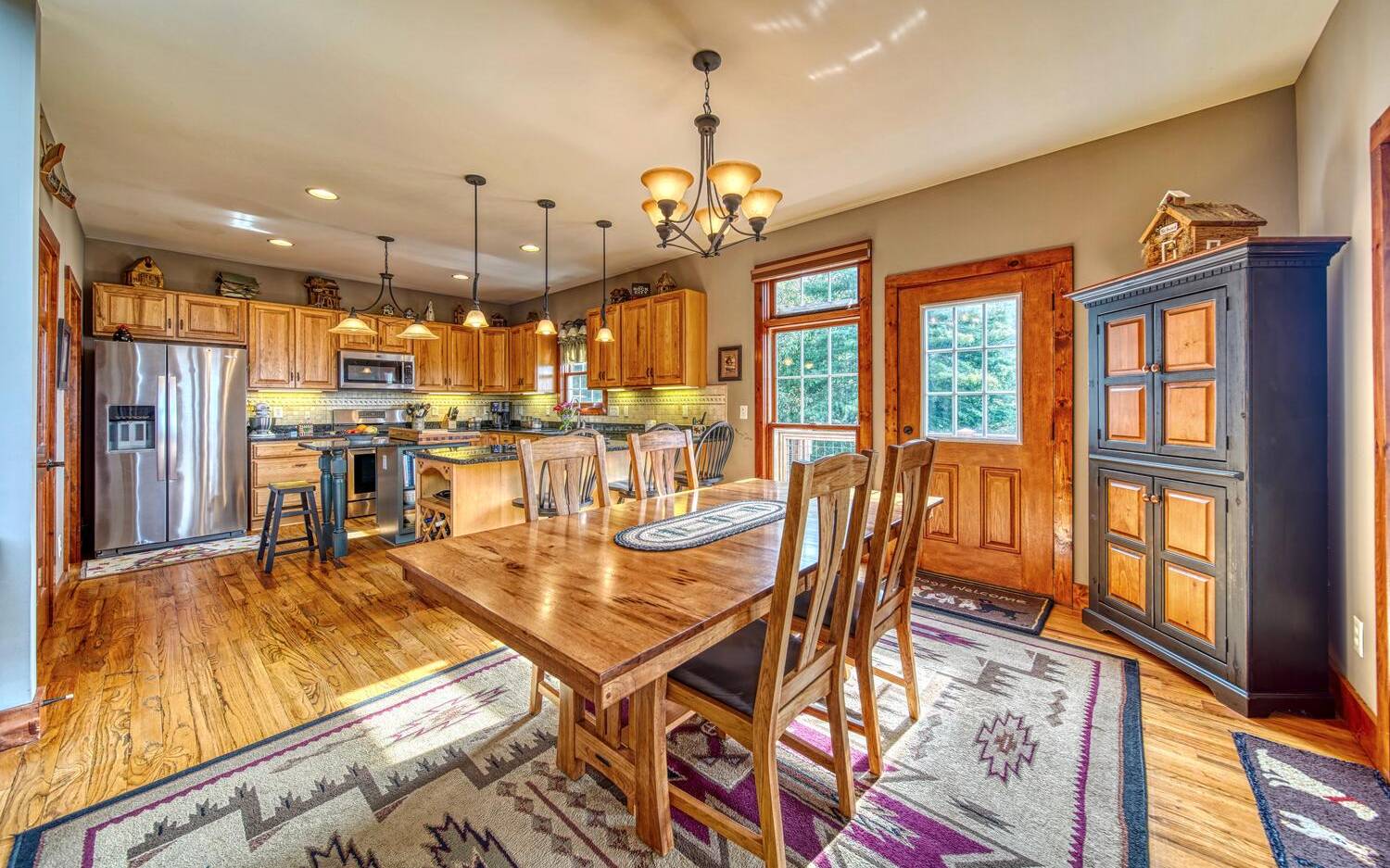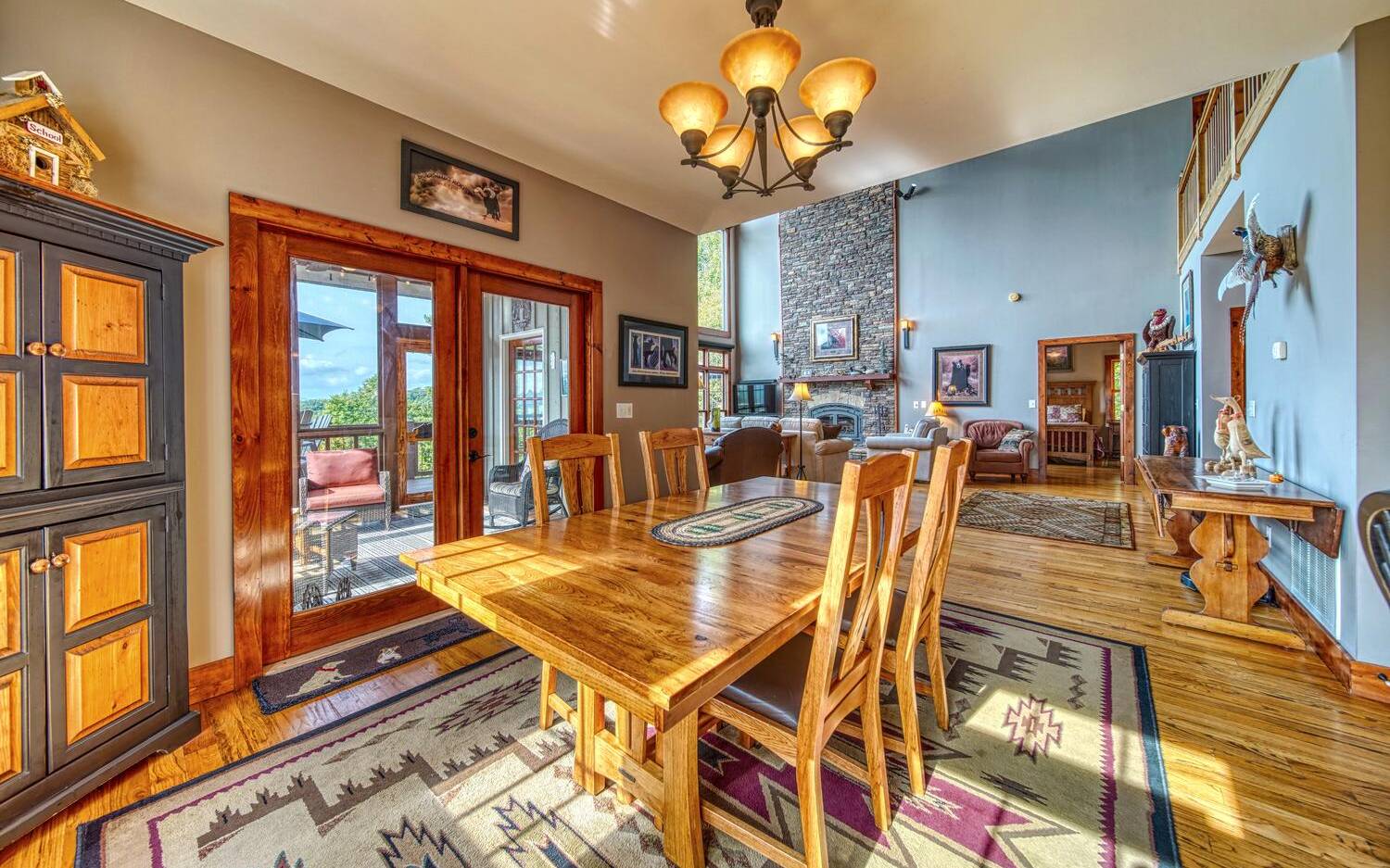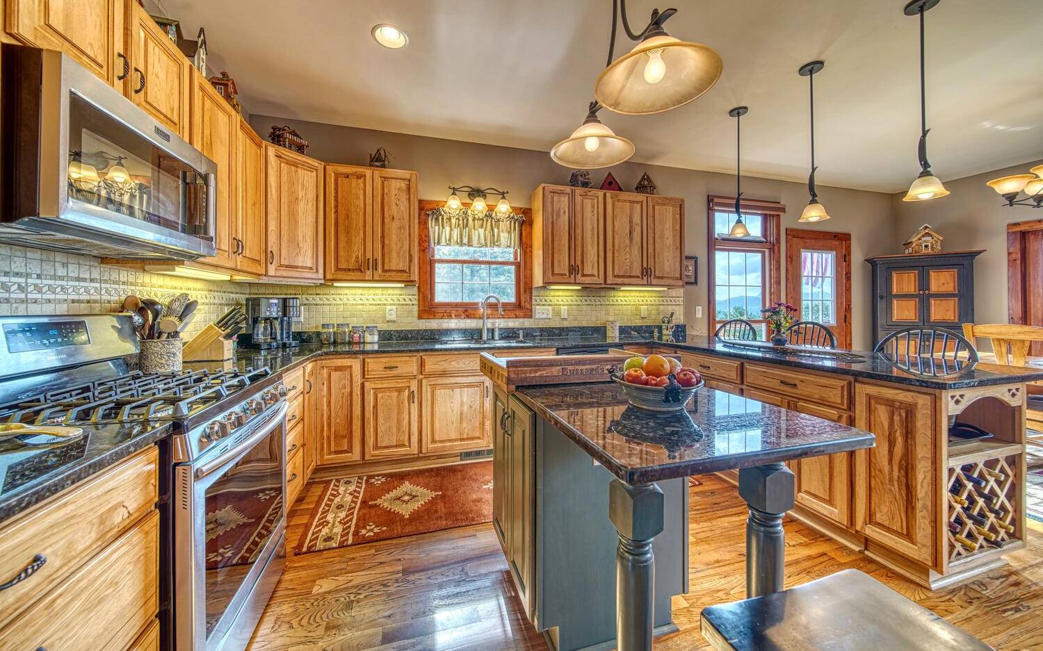 Private. Quiet. Magnificent! This mountain home 'lives large' with the scale, rooms & design to back it up! Wood floors, solid doors, gorgeous beams spanning the 28' main living with T&G ceiling & floor to ceiling stone fireplace all complement! Nice kitchen with SS, granite, pantry & laundry! Thru the adjacent dining to the screened porch & full width Trex deck with unobscured views & that sought after Southern Exposure as far as the eye can see! Primary on the main with deck access, 2 guest suites with their own baths up & great loft space for reading or work IF you can ignore the views! Terrace level offers another guest room & bath, workout/hobby/den, workshop & 2nd living area with 2nd fireplace & wet bar! Incredible privacy provided by nature with peeks of the golf course all accented by the addition of multiple fruit trees, grapevines and gorgeous perennials! Ready? This is your next move!