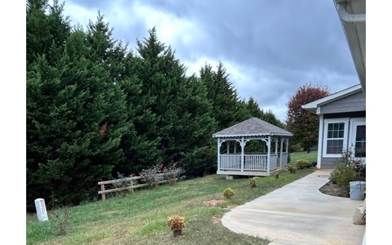 If location is a priority, this location is perfect! Almost new 3 bedroom/2 bath home built in 2021 but has rarely been lived in. One level living featuring dry-stack gas-log fireplace, vaulted ceilings in Great Room, and 9' ceilings throughout. Master bath has been expanded for more convenience. Owner added sunroom off dining area. Granite counters. Two-car garage plus outbuilding/she shed and gazebo to enjoy the outdoors. Excellent walking neighborhood. Close to shopping, schools, restaurants and much more.