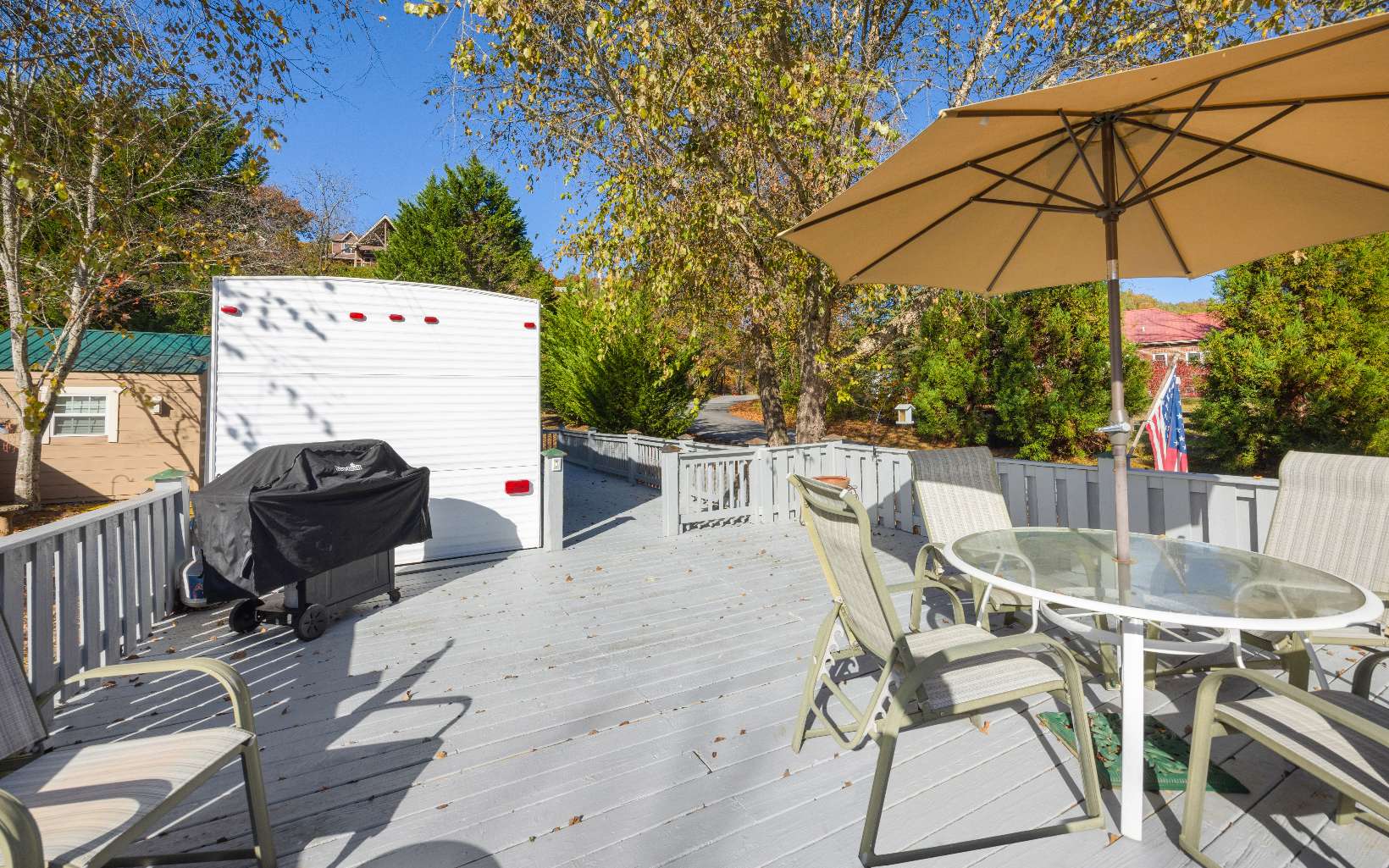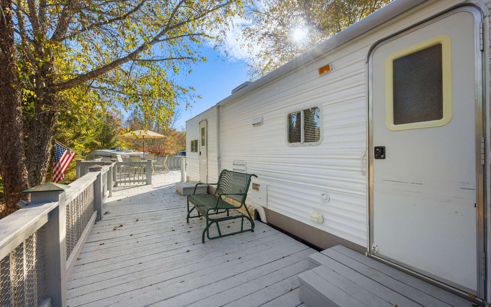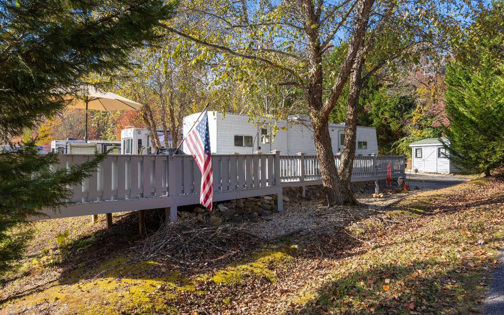 Welcome to River’s Edge…an RV community nestled along the Nottely River in the South-West section of Union Count…just moments to Vogel State Park, Helton Creek Falls, Brasstown Bald and Blairsville. This 2004 Travel Trailer is seated at the end of the Cul-de-Sac off of Timber Court with 2 Bedrooms and 1 Bath with slide out for Kitchen and Living areas. Master even has private door access onto decks. Outside you have decks galore to enjoy the great outdoors! The large party deck provides a welcoming sense of peace and serenity in the mountains. A storage shed offers loads of storage for all of your “stuff.” Rivers Edge boasts a Clubhouse and Pavilion with Shower and Laundry facilities and private community lake. HOA annual fee covers Water, Sewer, Trash, Lawn Care and common area maintenance.