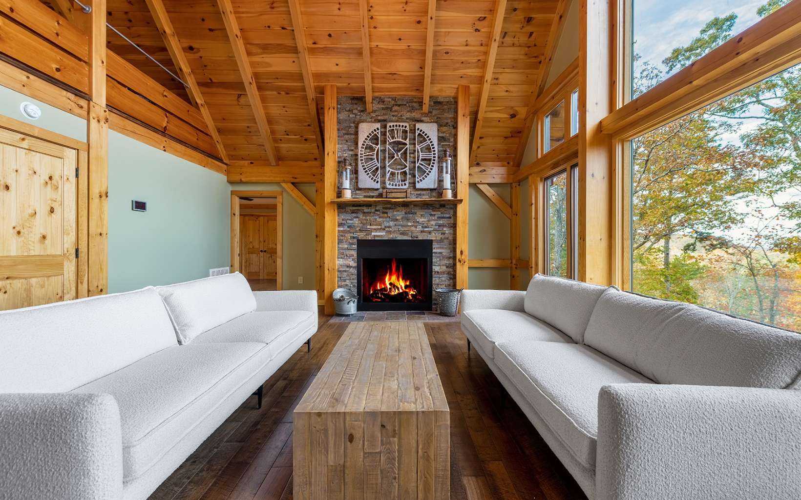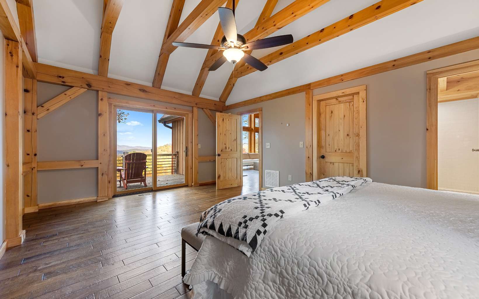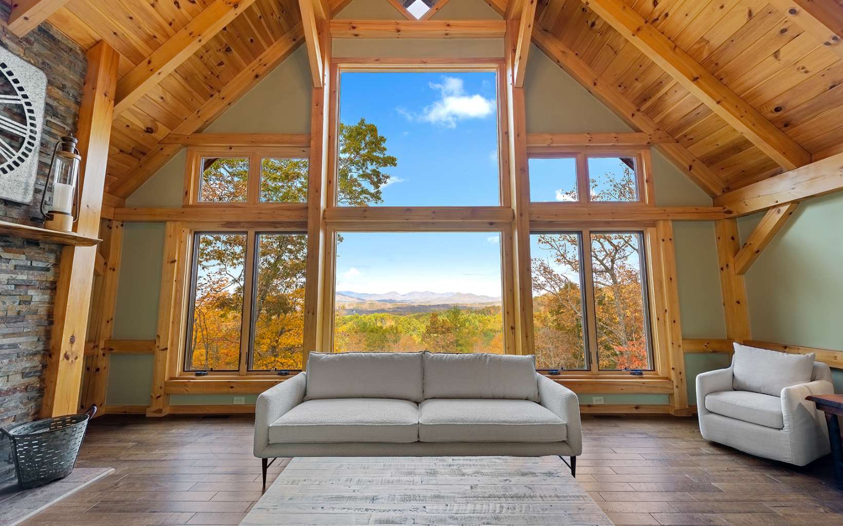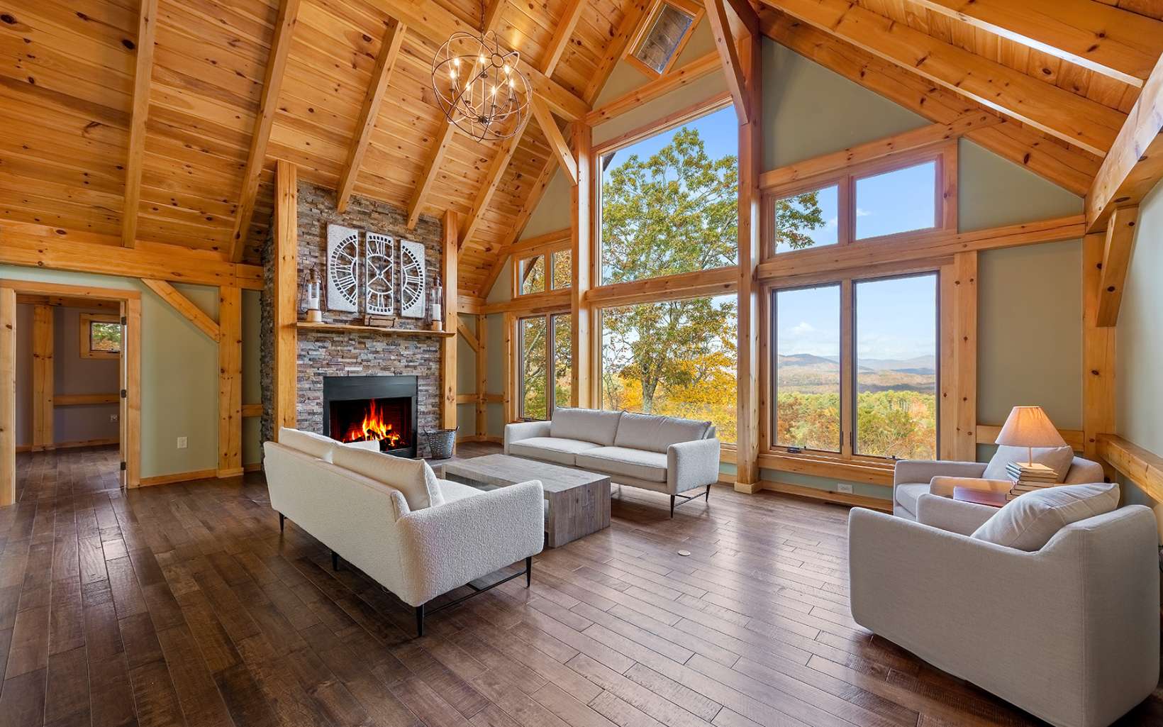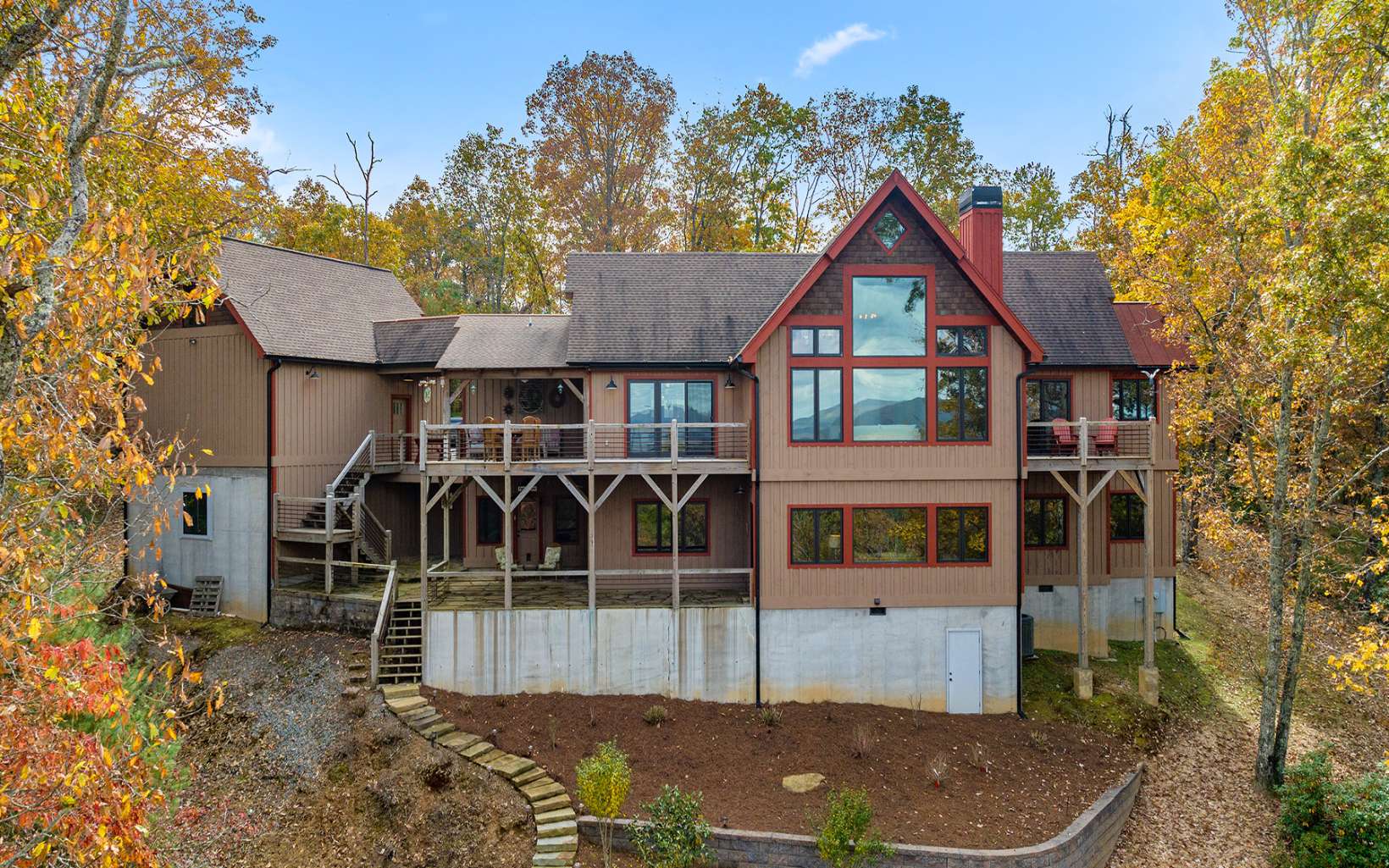 Custom built post and beam style chalet overlooking stunning layered mountain views, spanning decks, soaring cathedral ceilings, a warm and inviting rustic interior and low maintenance exterior, this is the Lodge at Spirit's Knob! Close to 4,000 heated square feet and on over five acres with two addt'l buildable lots on either side of the home included with the sale, this retreat is the perfect mountain getaway or full-time home w/ utmost privacy and pristine scenic views. The main house is accompanied by a detached three level garage with the main level fully finished, sub-level garage/workshop, and lofted office space above. Main house has four full bedrooms, inviting add'tl loft space, stone fireplaces, Anderson and Jeldwen windows and doors throughout, gourmet kitchen and large pantry/laundry/mudroom, primary bedroom with dual walk-in closets, and luxury lighting throughout. Centered around one of the best views in Fannin County and conveniently located less than 10 minutes to Downtown Blue Ridge and Lake Blue Ridge fully paved, this home is certainly one of a kind and won't last long. Call today!