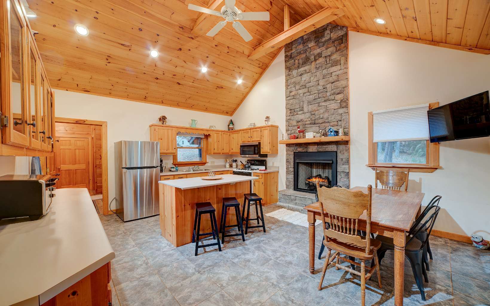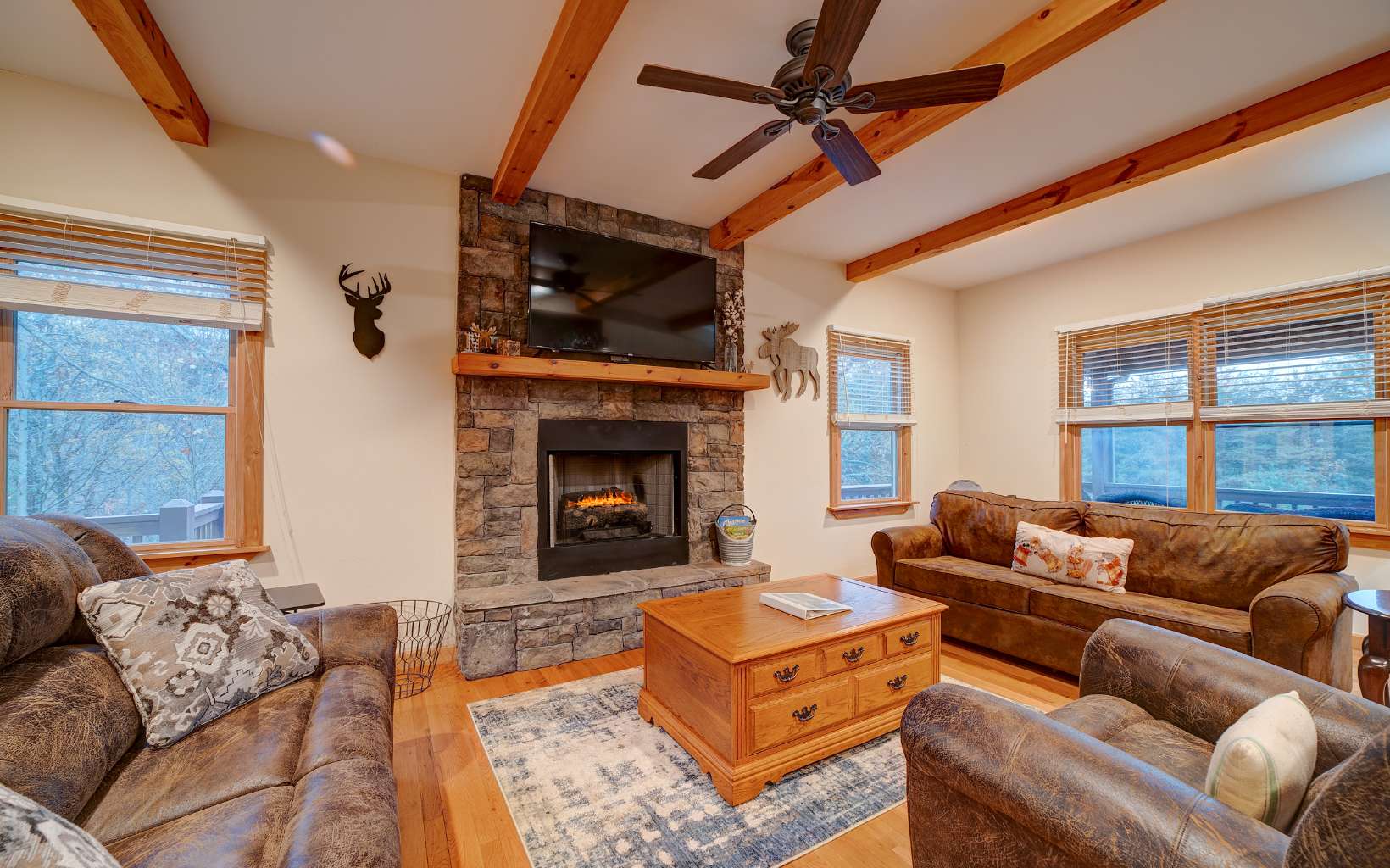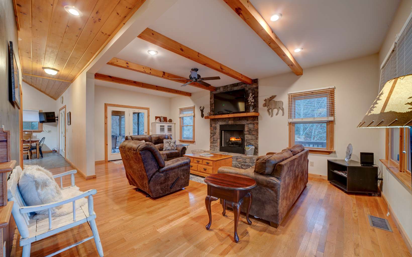Welcome to your Mountain Home! 5 bedrooms and 3.5 bathrooms, 2 car garage on 3 Acres! Enjoy Year-Round Mountain Views, layered decks and porches, and a party porch with hot tub! Featuring nine foot ceilings on the main floor, spacious living areas including a living room with wood beams across the ceiling. Large kitchen and dining area has its own fireplace and cathedral ceiling with screened outdoor dining. Primary Bedroom on the main floor with on suite has tile showers and granite counter tops. Oversized bedrooms upstairs with mountain views. Lower Level has a large game room with lots of room to play, hang out and enjoy yourself! 2 bedrooms and a bathroom downstairs. Hot tub deck is on the main level and private! This home also features a yard, the firepit area also has a mountainview! Come fall in love with this mountain home ready for you! Sold turn-key!