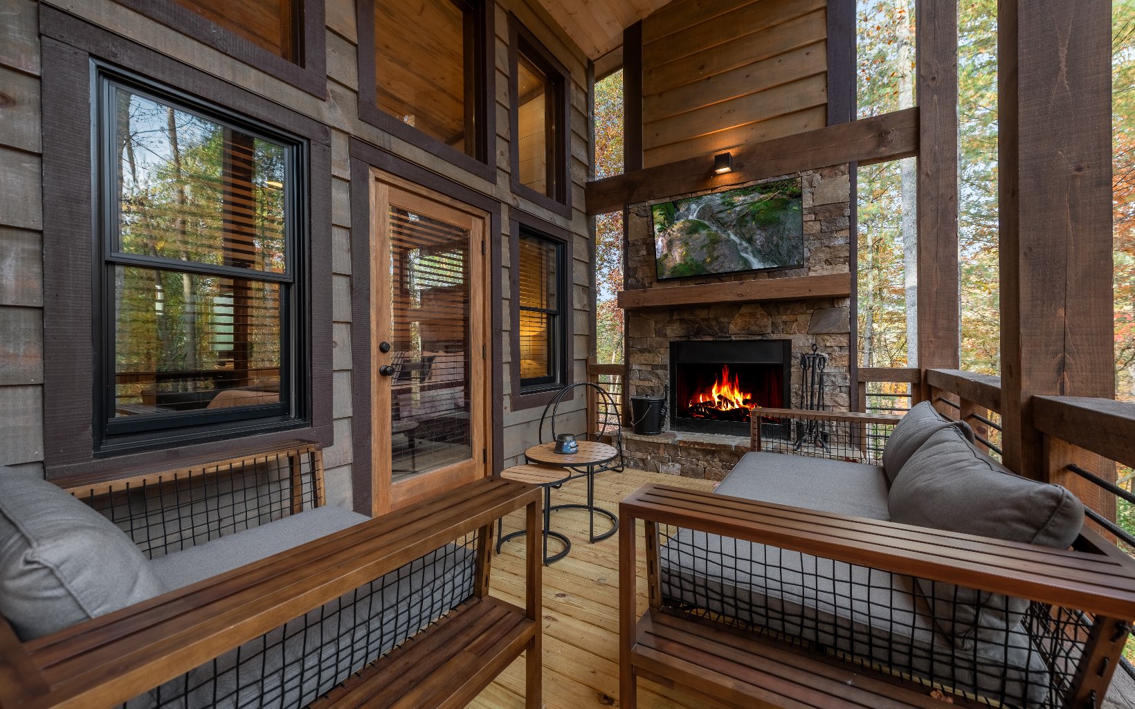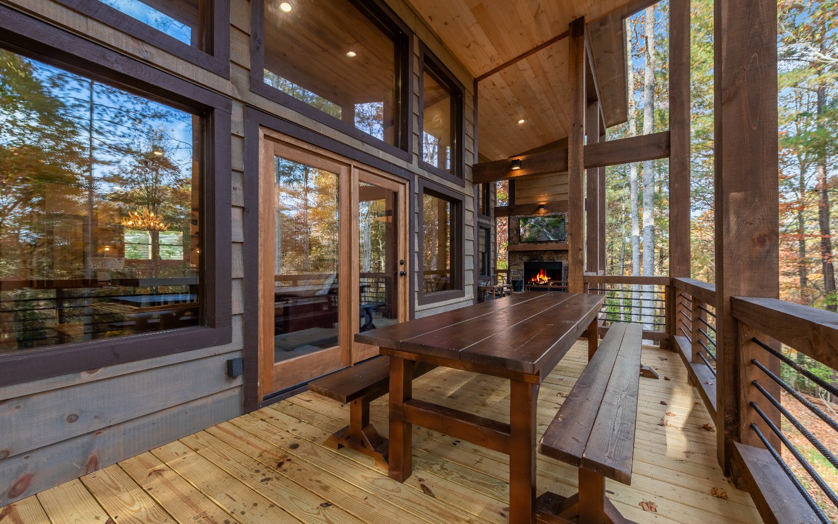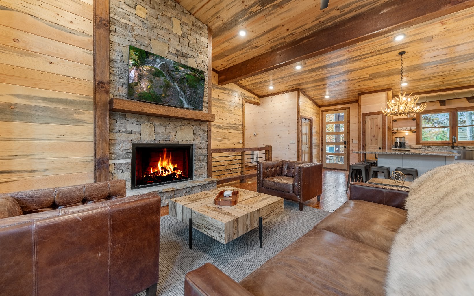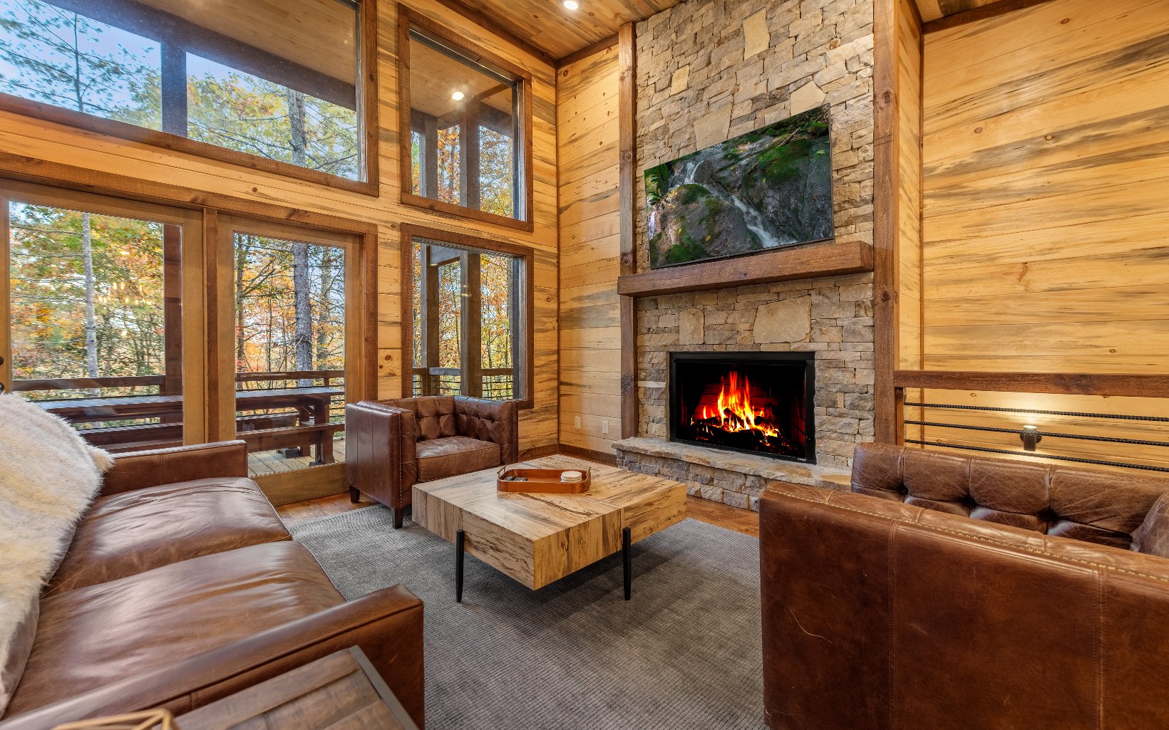 "Red Bird, Take Me Home!" -- situated within lush forestry and less than seven minutes to Downtown Blue Ridge, this contemporary rustic chalet makes for the perfect retreat! Complete with two levels of open-concept living, stacked stone fireplaces inside and out, large outdoor fire pit, jacuzzi spa area, luxury king suites, and comfortable queen bunk room! The space is the perfect blend of modern and rustic w/ bountiful natural light and walls of glass in every room. Main level is complete with large kitchen and eat-in island, comfortable living room w/ luxurious furnishings and stacked stone gas burning fireplace, french doors leading to large deck and custom farm table, outdoor living room and additional wood burning fireplace. Find two large king suites on the main level w/ their own walk-in closets, tile showers, and dual vanities. On the terrace level, home is complete w/ large den space and fireplace, wet bar, game table, walk-out terrace deck w/ swing bed, spa jacuzzi and fire pit! Find an additional large king suite w/ tile shower and an additional comfortable bunk room complete with four queen bunks, walk-in closet and ensuite bathroom. Sold TURN-KEY and grossing over $100k in rental revenue!