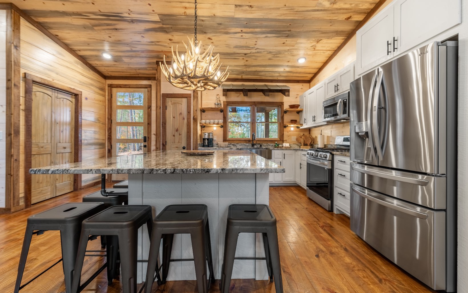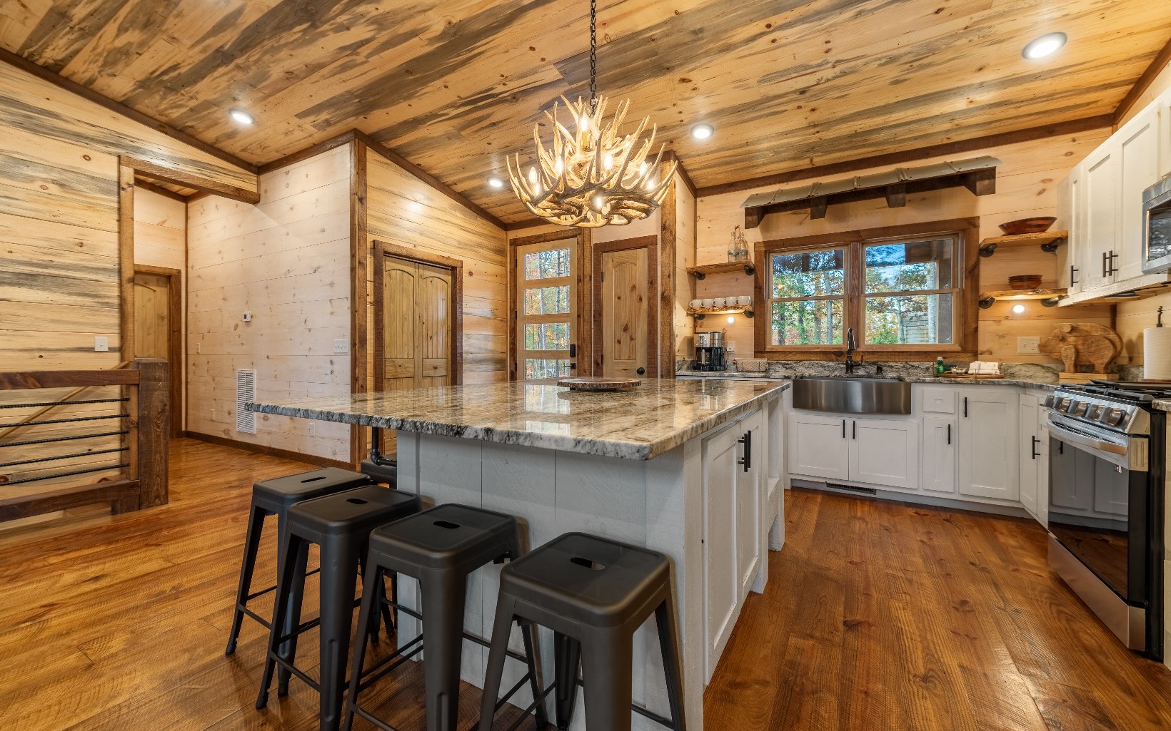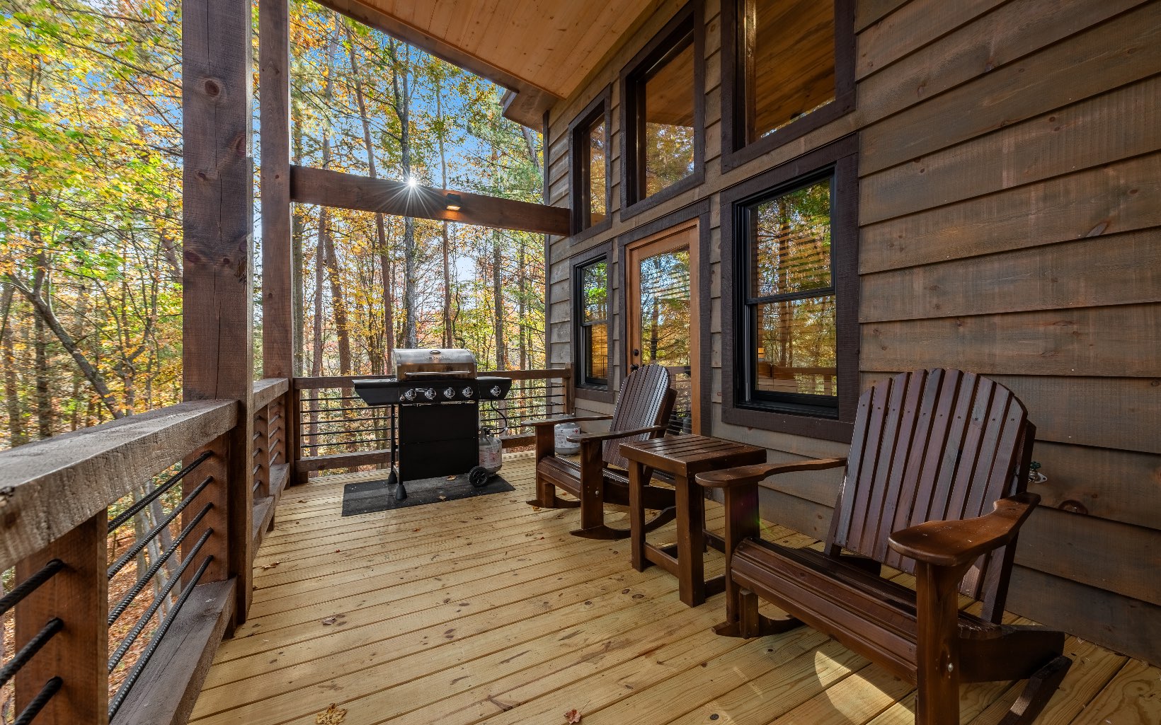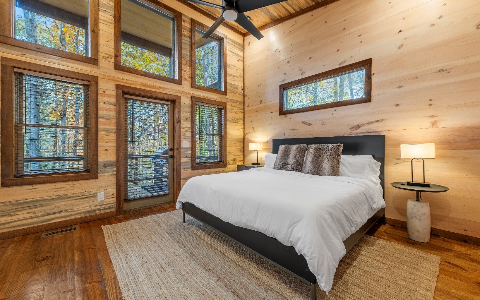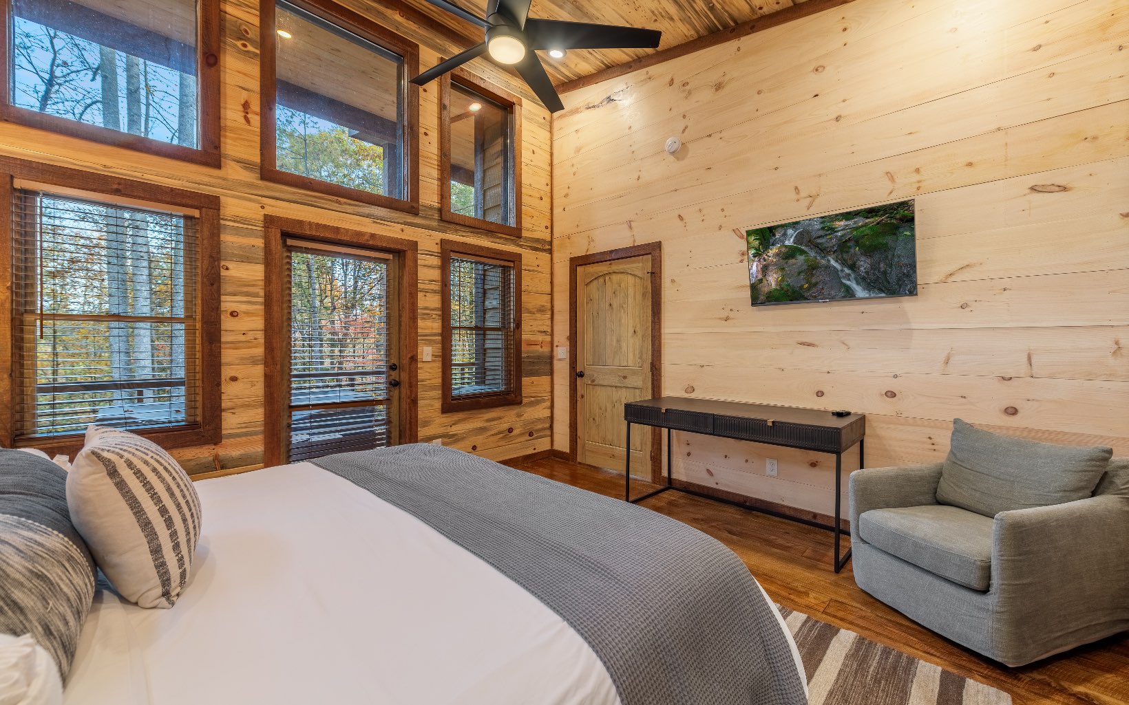 "Red Bird, Take Me Home!" -- situated within lush forestry and less than seven minutes to Downtown Blue Ridge, this contemporary rustic chalet makes for the perfect retreat! Complete with two levels of open-concept living, stacked stone fireplaces inside and out, large outdoor fire pit, jacuzzi spa area, luxury king suites, and comfortable queen bunk room! The space is the perfect blend of modern and rustic w/ bountiful natural light and walls of glass in every room. Main level is complete with large kitchen and eat-in island, comfortable living room w/ luxurious furnishings and stacked stone gas burning fireplace, french doors leading to large deck and custom farm table, outdoor living room and additional wood burning fireplace. Find two large king suites on the main level w/ their own walk-in closets, tile showers, and dual vanities. On the terrace level, home is complete w/ large den space and fireplace, wet bar, game table, walk-out terrace deck w/ swing bed, spa jacuzzi and fire pit! Find an additional large king suite w/ tile shower and an additional comfortable bunk room complete with four queen bunks, walk-in closet and ensuite bathroom. Sold TURN-KEY and grossing over $100k in rental revenue!
