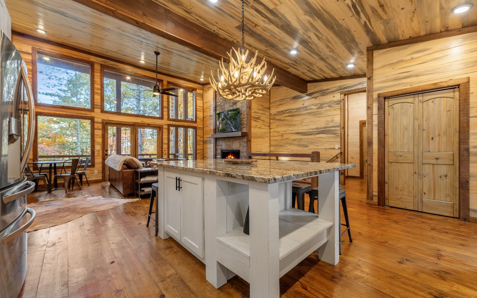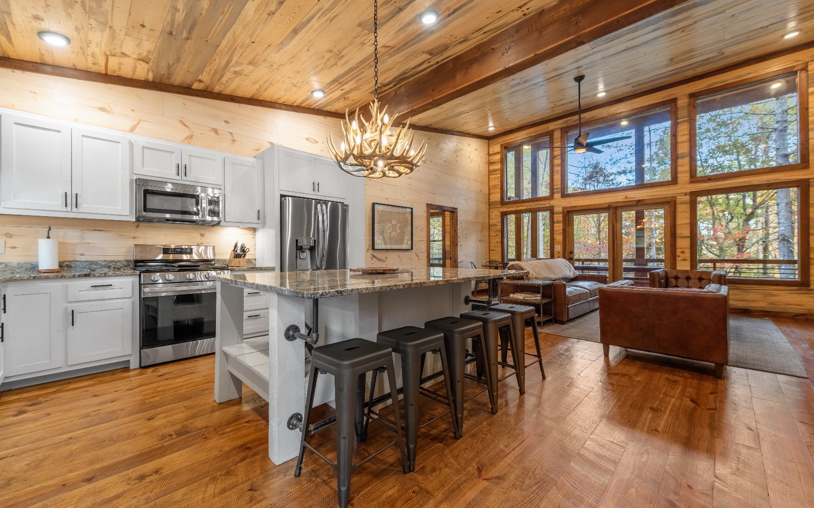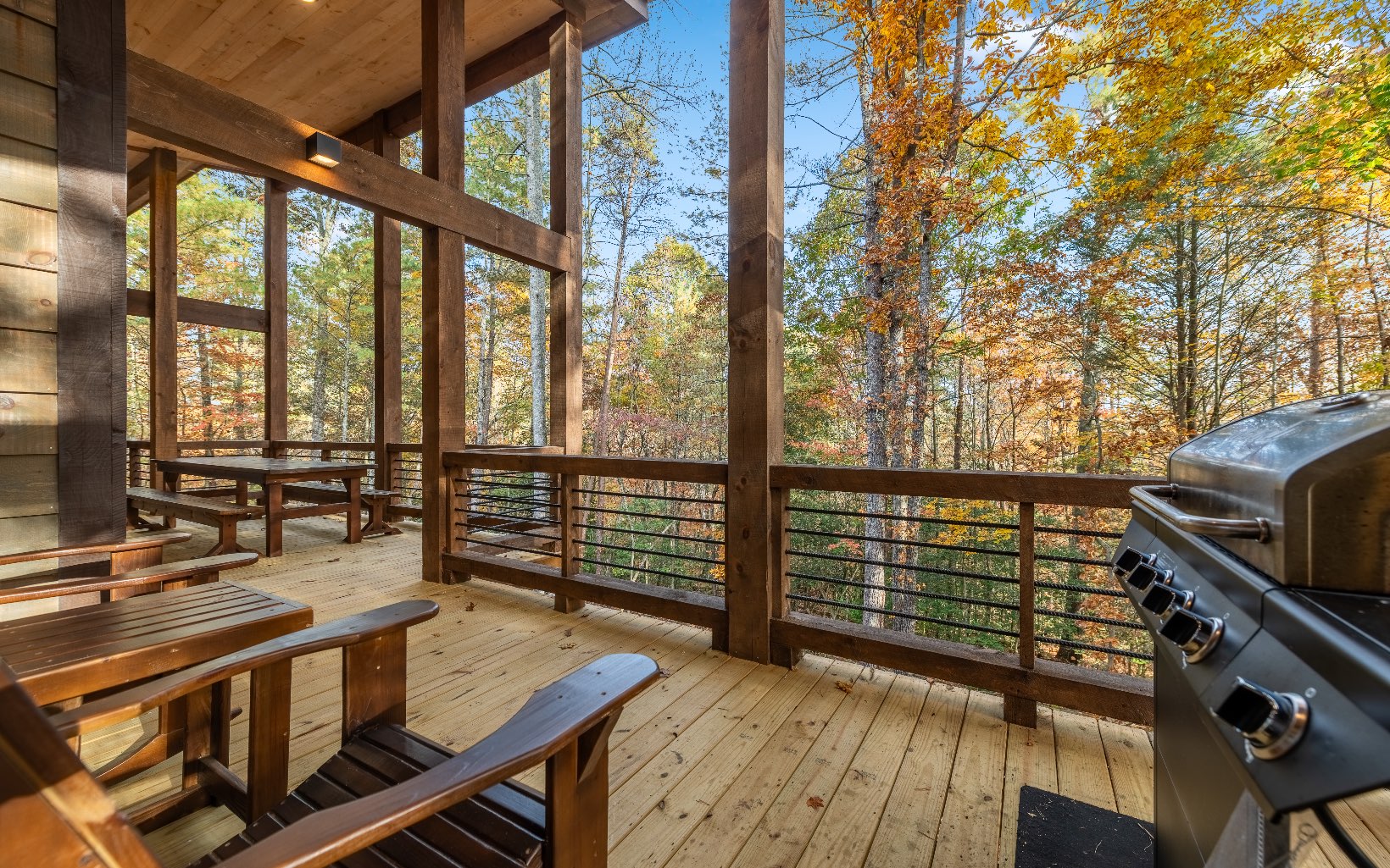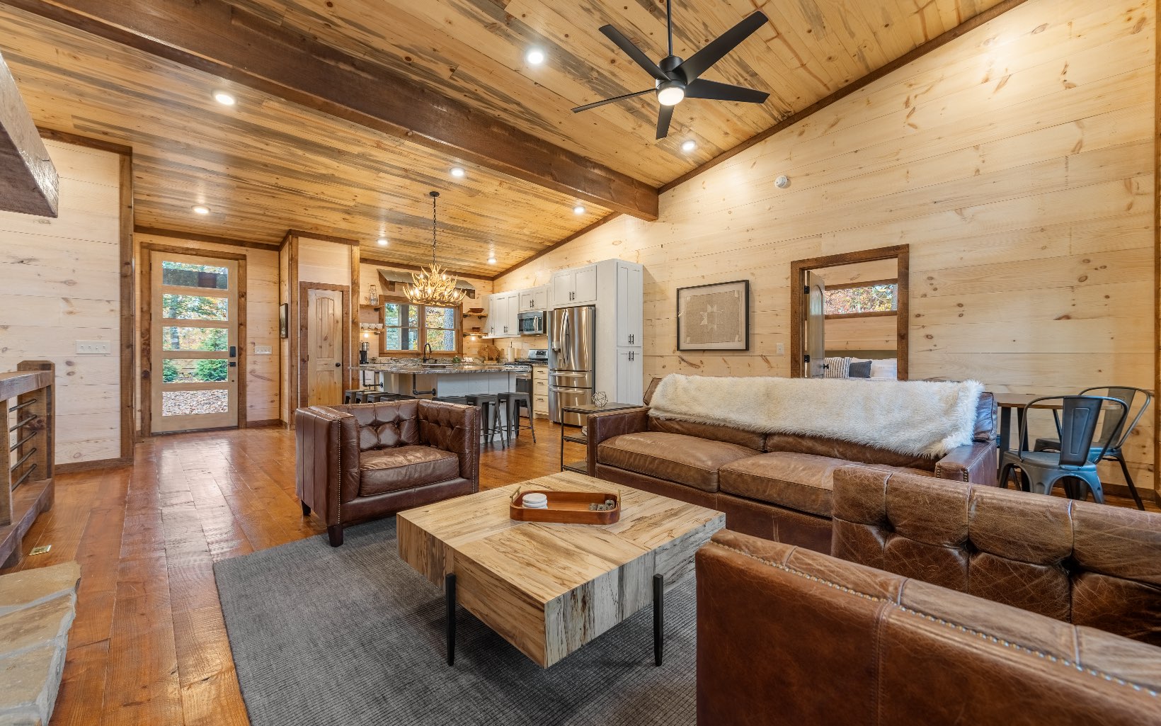 "Red Bird, Take Me Home!" -- situated within lush forestry and less than seven minutes to Downtown Blue Ridge, this contemporary rustic chalet makes for the perfect retreat! Complete with two levels of open-concept living, stacked stone fireplaces inside and out, large outdoor fire pit, jacuzzi spa area, luxury king suites, and comfortable queen bunk room! The space is the perfect blend of modern and rustic w/ bountiful natural light and walls of glass in every room. Main level is complete with large kitchen and eat-in island, comfortable living room w/ luxurious furnishings and stacked stone gas burning fireplace, french doors leading to large deck and custom farm table, outdoor living room and additional wood burning fireplace. Find two large king suites on the main level w/ their own walk-in closets, tile showers, and dual vanities. On the terrace level, home is complete w/ large den space and fireplace, wet bar, game table, walk-out terrace deck w/ swing bed, spa jacuzzi and fire pit! Find an additional large king suite w/ tile shower and an additional comfortable bunk room complete with four queen bunks, walk-in closet and ensuite bathroom. Sold TURN-KEY and grossing over $100k in rental revenue!