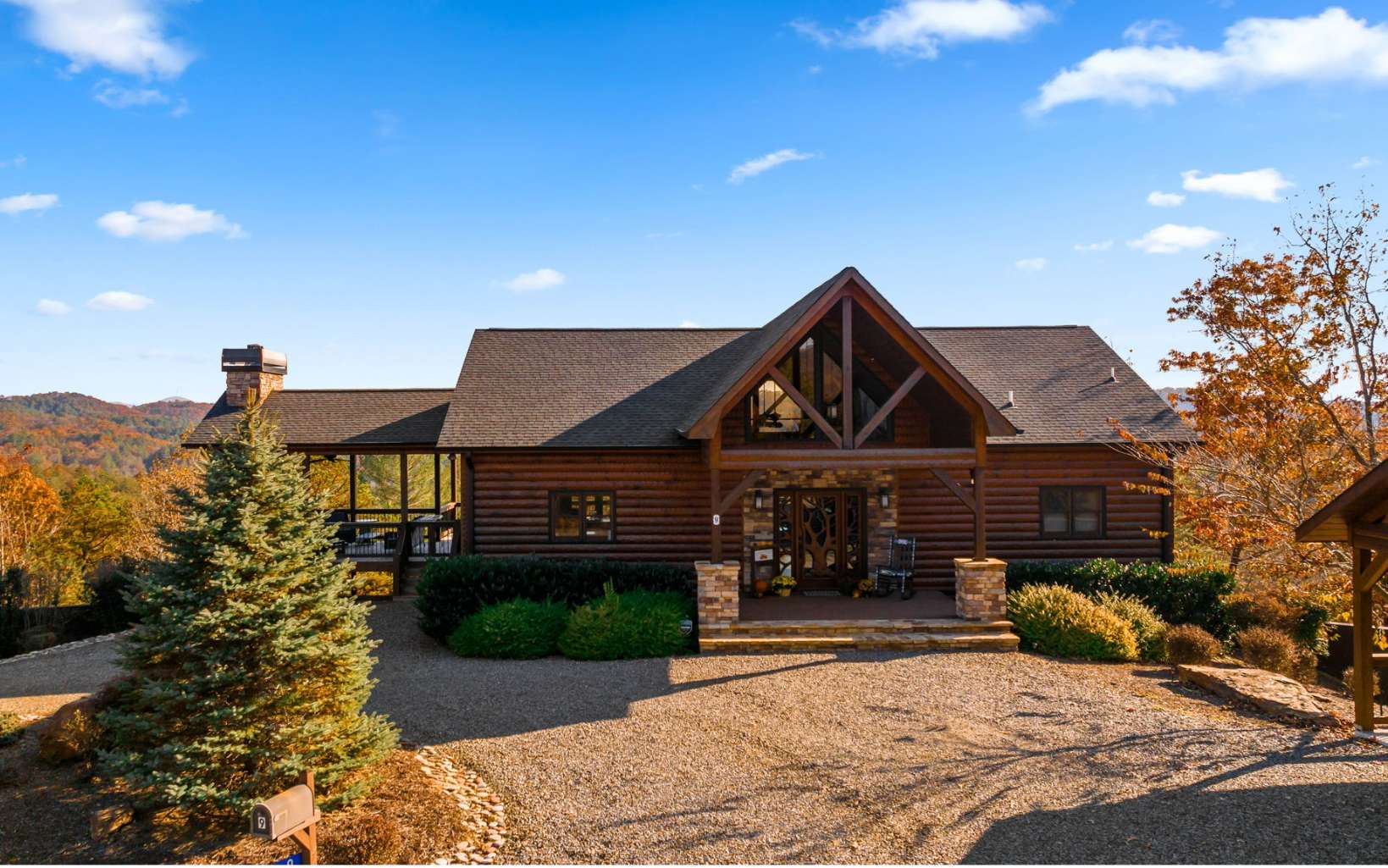 Located in The Highlands of Blue Ridge, this stunning custom-built cabin overlooks the beautiful North Georgia Mountains with incredible long-range views. The large foyer welcomes you inside to the beautiful great room with stone fireplace and cathedral ceilings. A true cooks kitchen and dining area lead to a wraparound porch with woodburning fireplace just perfect for entertaining and taking in the views!. Master bedroom with private bath, laundry and powder room are also located on the main level. Downstairs you will find a large den with stone fireplace, game area, wet bar with wine and beverage coolers, 2 bedrooms, full bath and another wraparound porch for relaxing. Ask about the "hidden" room which makes for a perfect office or craft room! Shown by appointment. Some furnishings included.