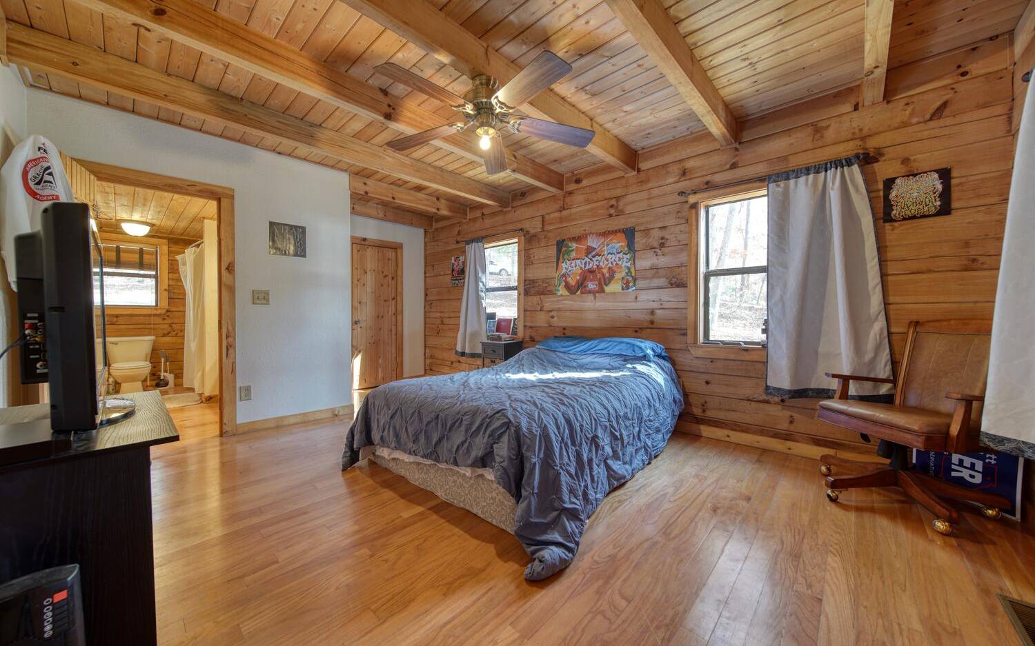 Lots of house for the money, PLUS seller may provide CLOSING COST ASSISTANCE to the BUYER! This 3BR/3BA real log home is situated in a private setting and is conveniently located just minutes from downtown Blairsville and even closer to Lake Nottely and all the outdoor activities you come to the mountains for! Your new real log home features a complimentary mix of wood and drywall and hardwood floors throughout There's a galley-style kitchen with dining area, living room with gas log fireplace and soaring ceilings. The main floor features one of two master suites as well as a guest bedroom and bath. The upper level has a second smaller master or guest suite. Love the outdoors? Then you'll love the full-length screened porch overlooking the back yard - it's a great spot to lounge with a cup of hot cocoa on a chilly fall evening! This one is even a great investment opportunity as it comes with an active tenant lease, however, the tenant is willing to stay or relocate if you want to use the home yourself!!