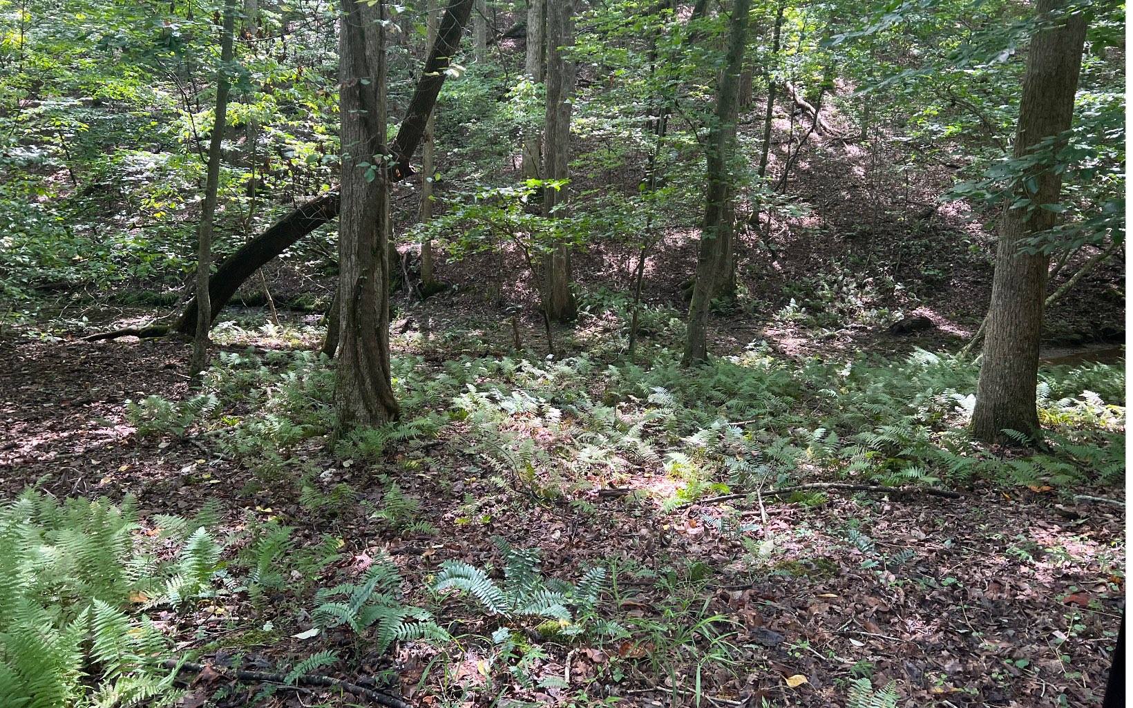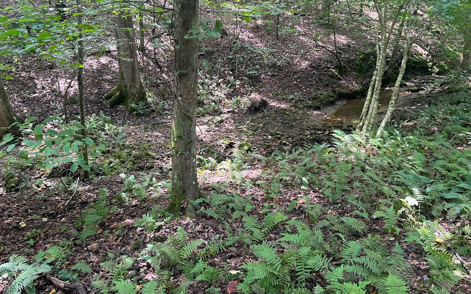 level, gentle lot with a wet weather branch in front of the lot slight elevation up to house site ar