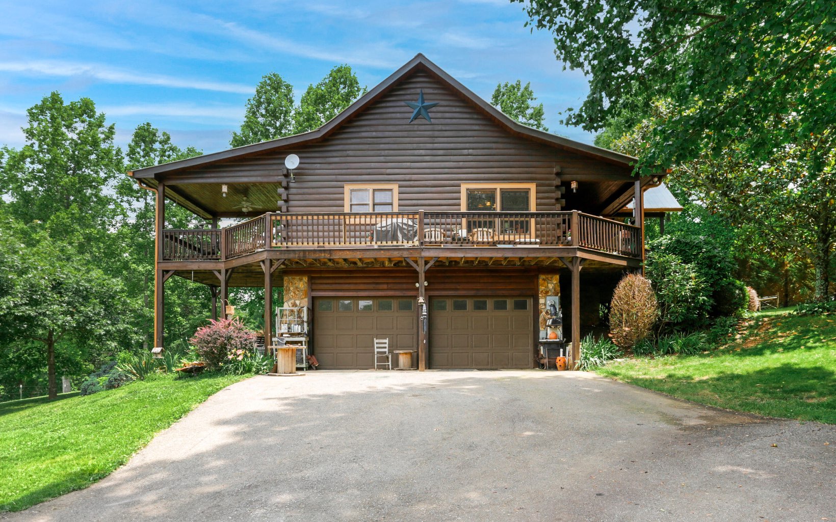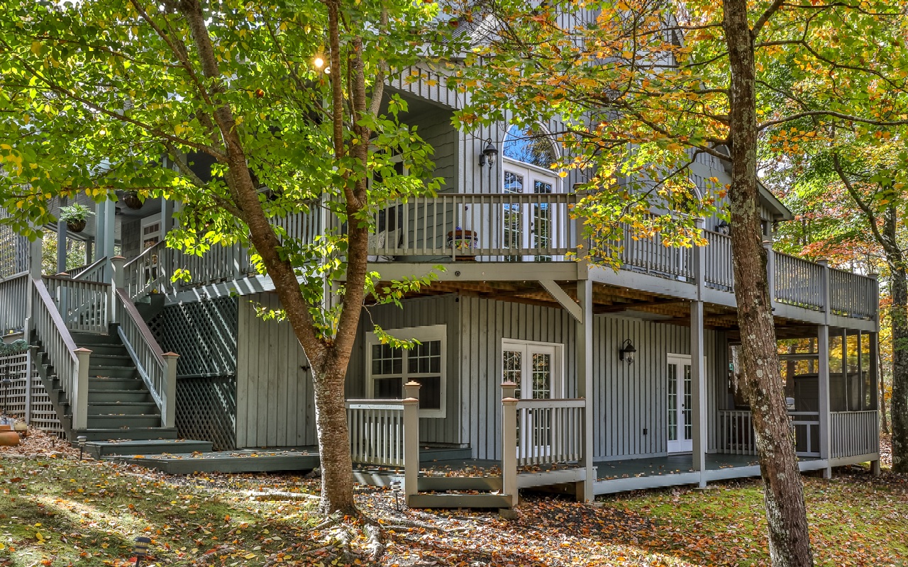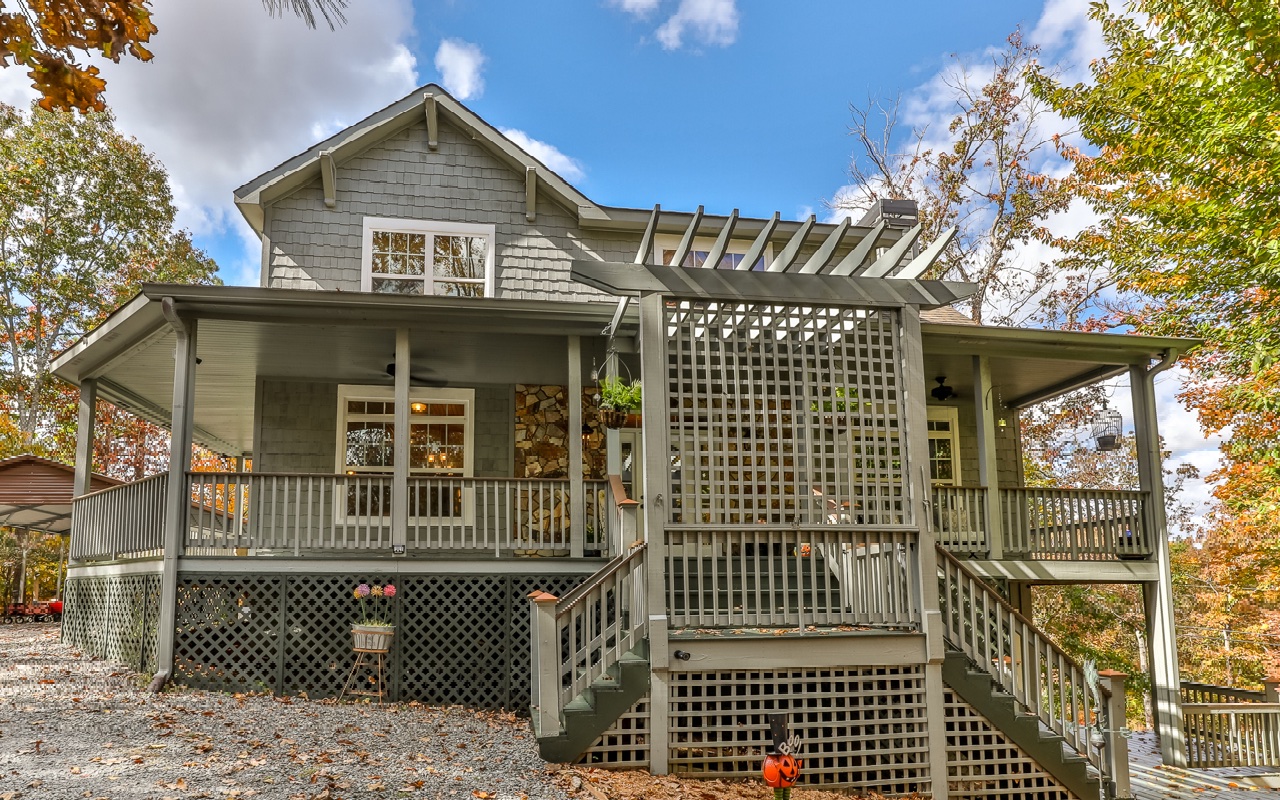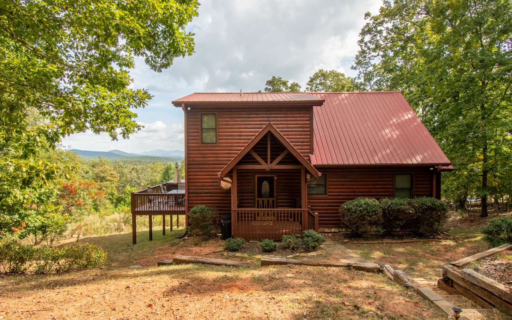 Truly “Above it All” with PANORAMIC views that will absolutely take your breath away! This upgraded/updated FULLY FURNISHED 3BR/3BA log mountain home will satisfy all your wants & needs. WRAP AROUND DECKS! Master Suite is located upstairs with majestic views while soaking in the jetted tub. Warm