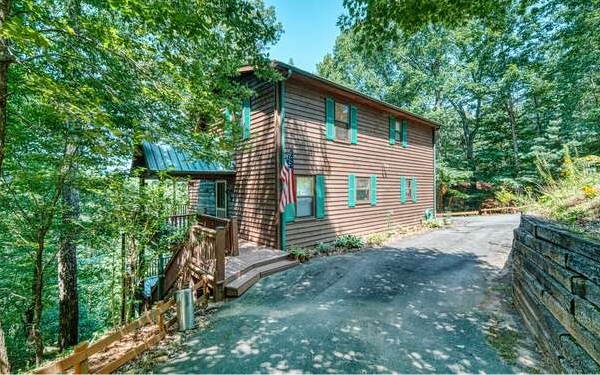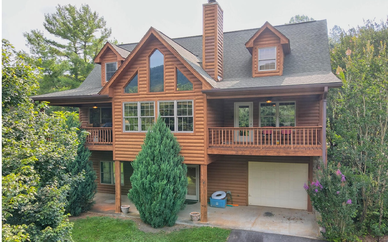 Cabin in the Mountains? Look no further. Enjoy year round mountain views from this well maintained and spacious home. Main level offers carport parking, an open floor plan, with a large rock fireplace, eat in kitchen and dining, master suite with private walk out porch, also walk out porch from dini