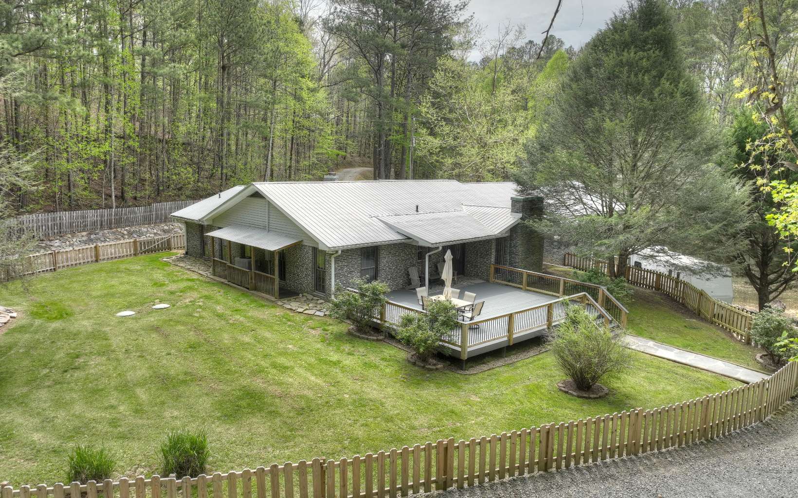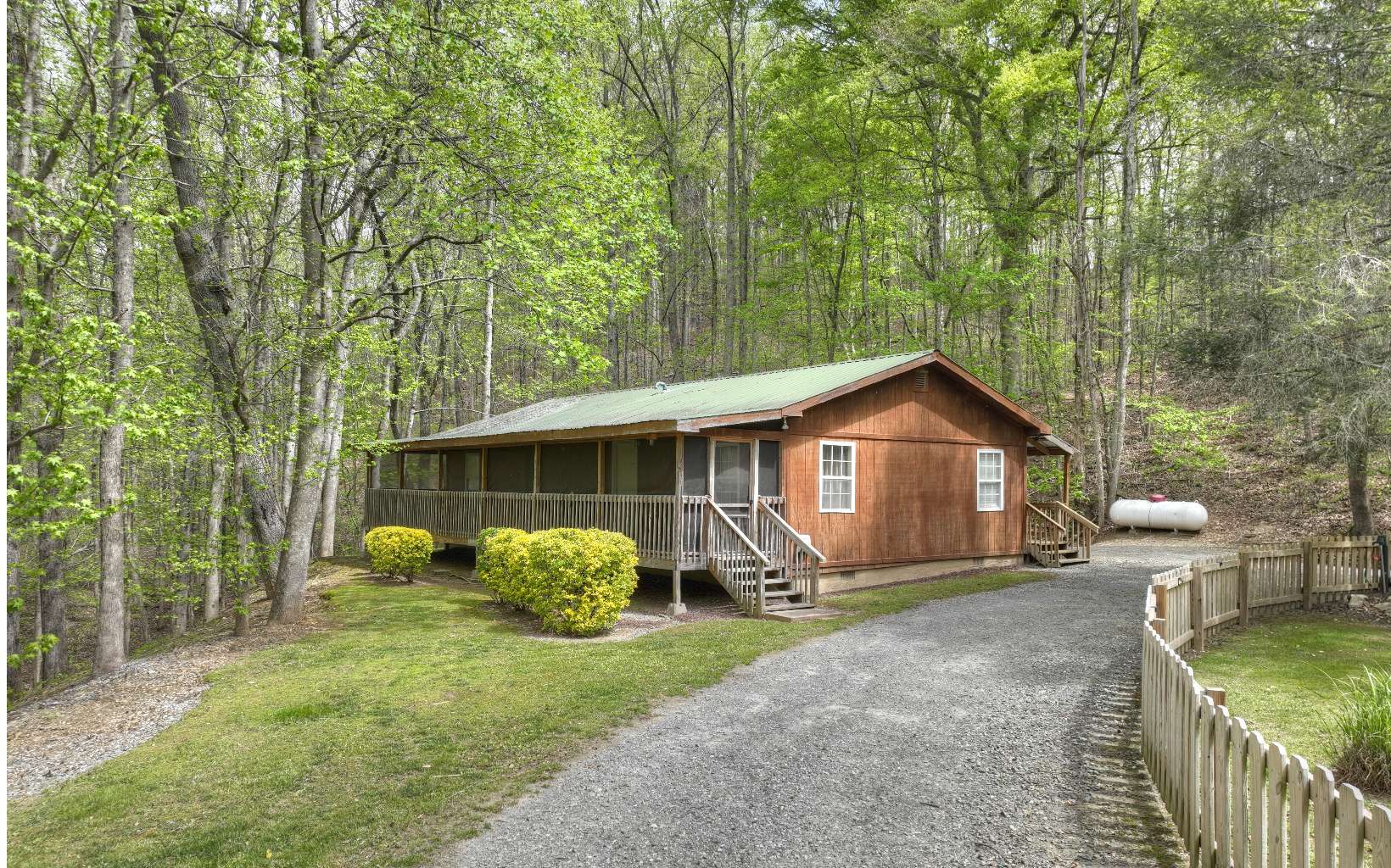 ONE LEVEL LIVING WITH ABSOLUTE PRIVACY ON NEARLY 8 ACRES IN THE NORTH CAROLINA MOUNTAINS! This cabin offers a living room with vaulted ceiling, stacked stone fireplace & skylights creating a light atmosphere, kitchen with breakfast nook area plus a dining area with access to private back porch with