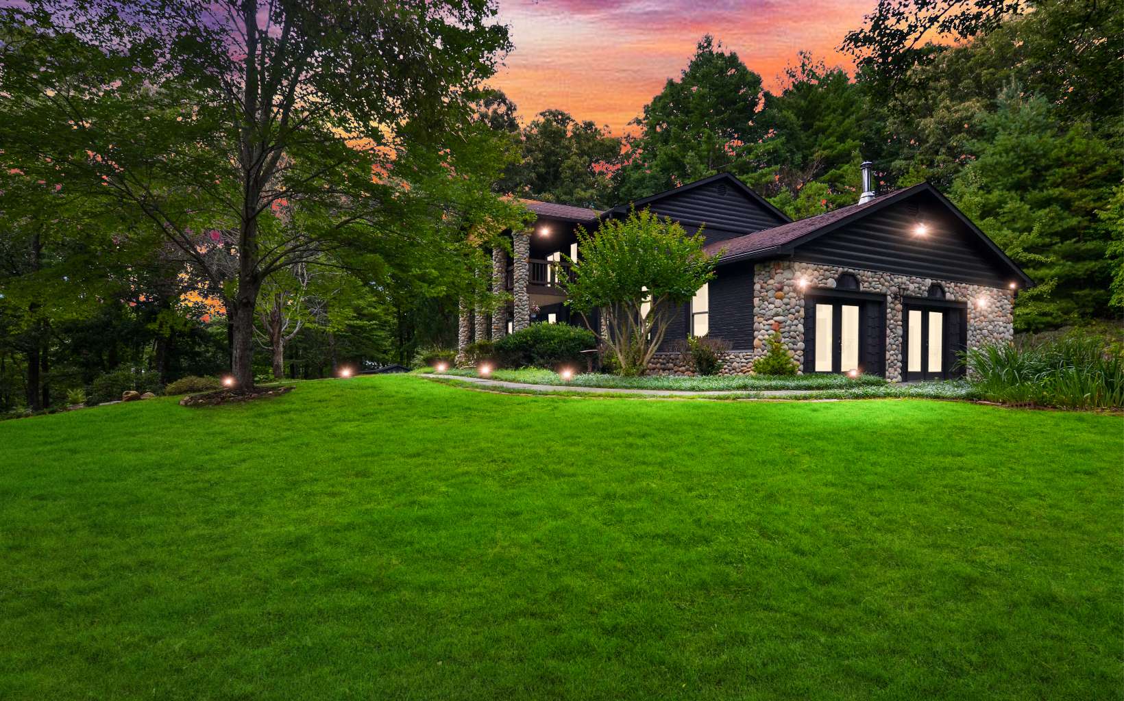 New Log Craftsmanship Lodge on cool 3,000 ft elevation North GA Mountain top, almost 3 acres and fantastic views! 4 Bedrooms with en-suite spa baths with flagstone floors in baths and custom tile work. 1 steam shower on terrace-level. Master bedroom features impressive stone fireplace and enormous d