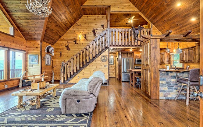 EASY ACCESS ONE LEVEL LIVING IN THE GORGEOUS NORTH GEORGIA MOUNTAINS! This immaculate cabin offers 2 bedrooms and 2 bathrooms; perfect for year around living or a weekend getaway, an open floor plan, great room with a vaulted ceiling, stone fireplace and hardwood floors. The master bedroom has an en