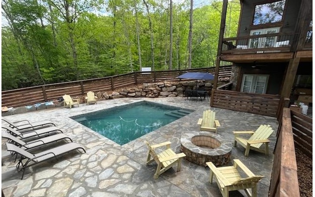 Retreat to the mountains of Blue Ridge! Sprawling 4 bedroom, 3 bath mountain home, perfect for full-time living or a vacation rental. Low maintenance home and landscaping. Large living area with stone, wood-burning fireplace, real wooden floors and stunning pine walls. Great room area opens onto a h