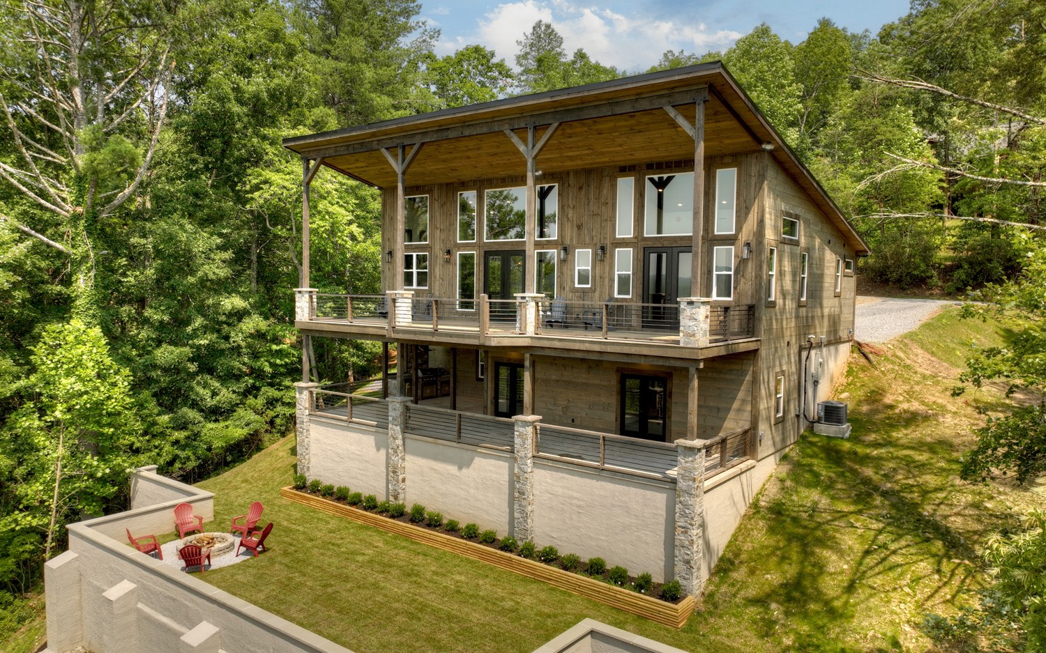 Refined Rustic Riverfront stunner with Contemporary Lines & Modern Motif in the overlooking …the Toccoa and layered mountains…this 4 bedroom/4.5 bath charmer is nestled on gorgeous wooded lot atop the mountain with long range mountain & unobstructed river views ...warm wood finishes with light &