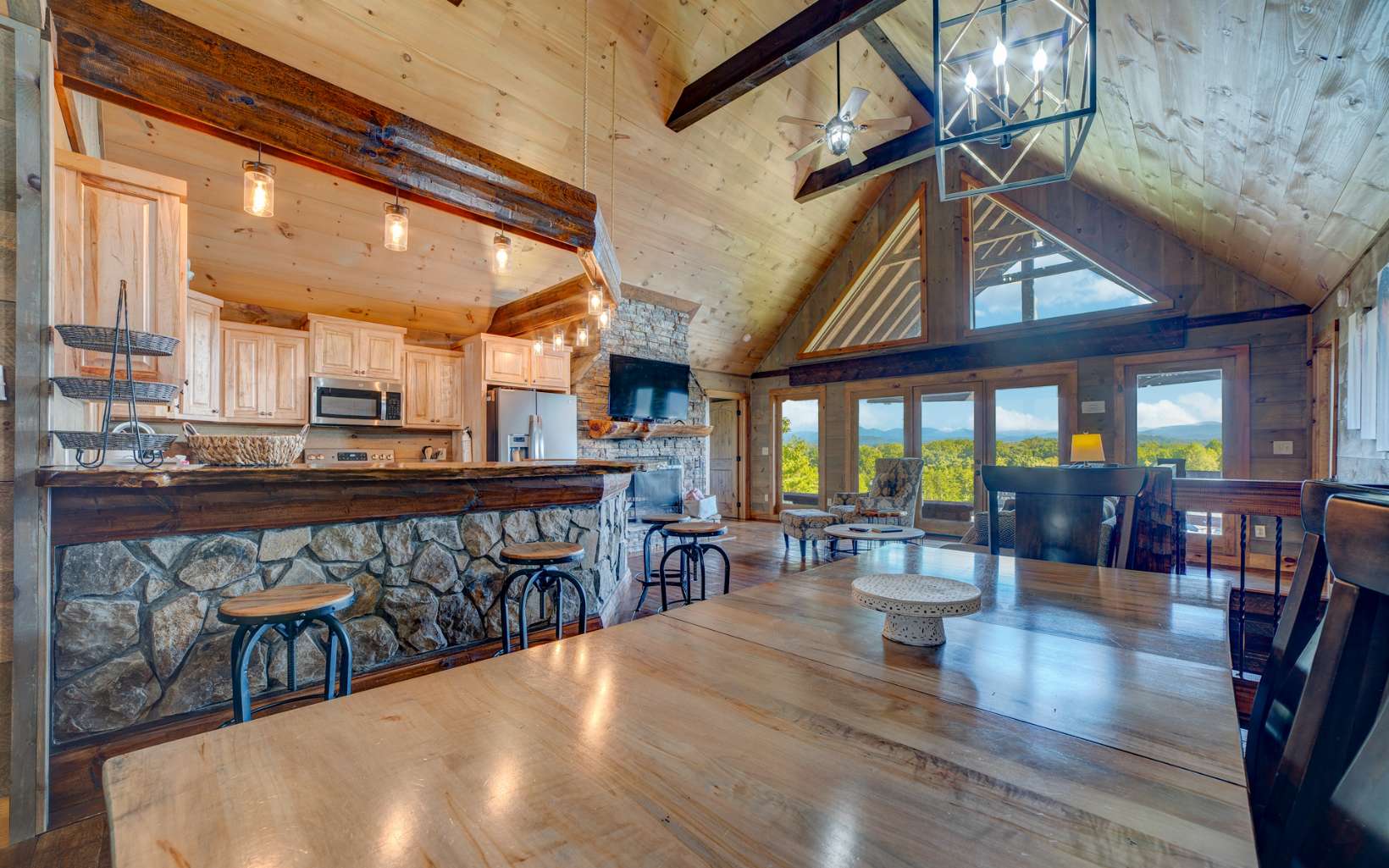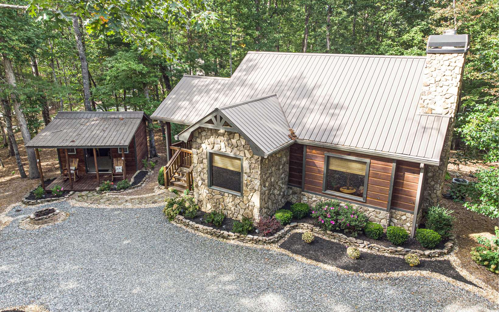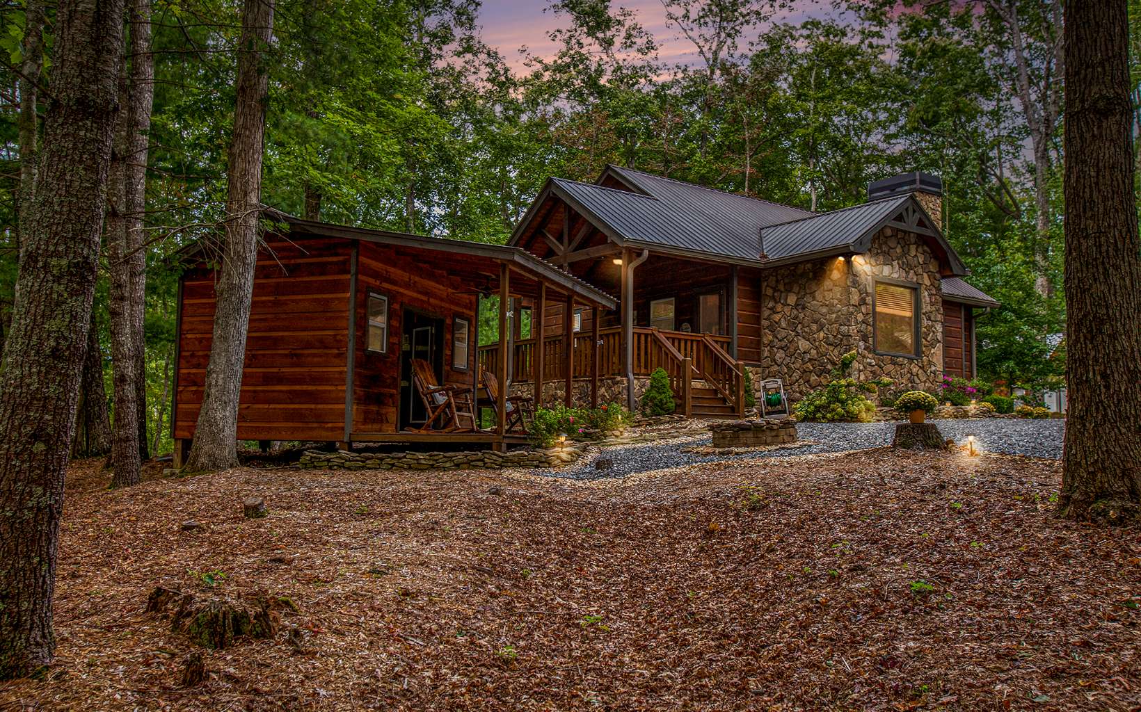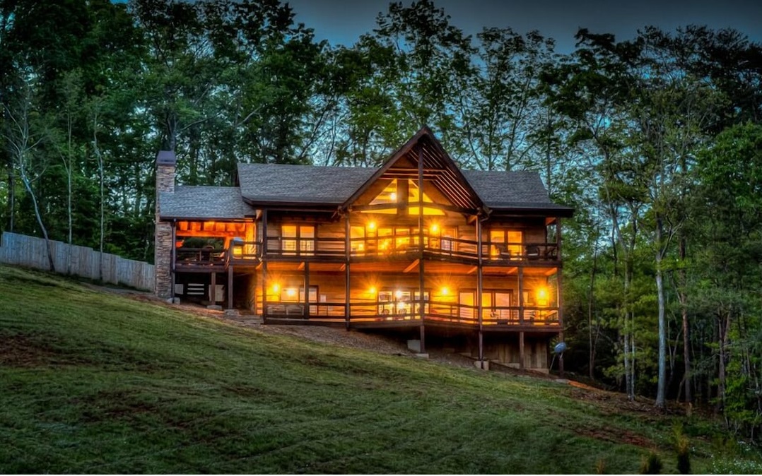 "Red Bird, Take Me Home!" -- situated within lush forestry and less than seven minutes to Downtown Blue Ridge, this contemporary rustic chalet makes for the perfect retreat! Complete with two levels of open-concept living, stacked stone fireplaces inside and out, large outdoor fire pit, jacuzzi spa